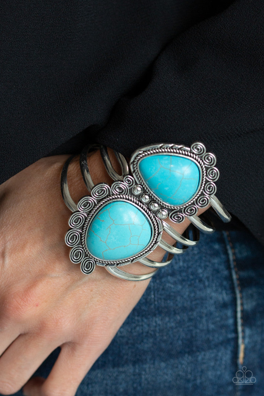 Two asymmetrical turquoise stones are pressed into abstract silver frames radiating with swirling and dotted textures. The ornate frame attaches to one side of the stacked silver bars, creating a versatile centerpiece as the cuff opens up to the side. Features a hinged closure.