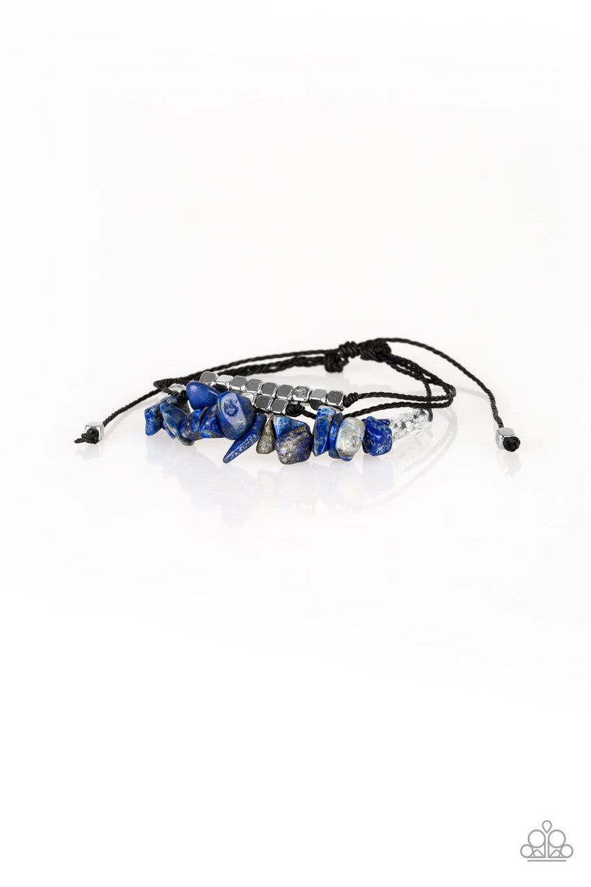 Bits of natural blue stone, clear beads, and silver cube beads are threaded along strands of dainty black cording for a seasonal look. Features an adjustable sliding knot closure.