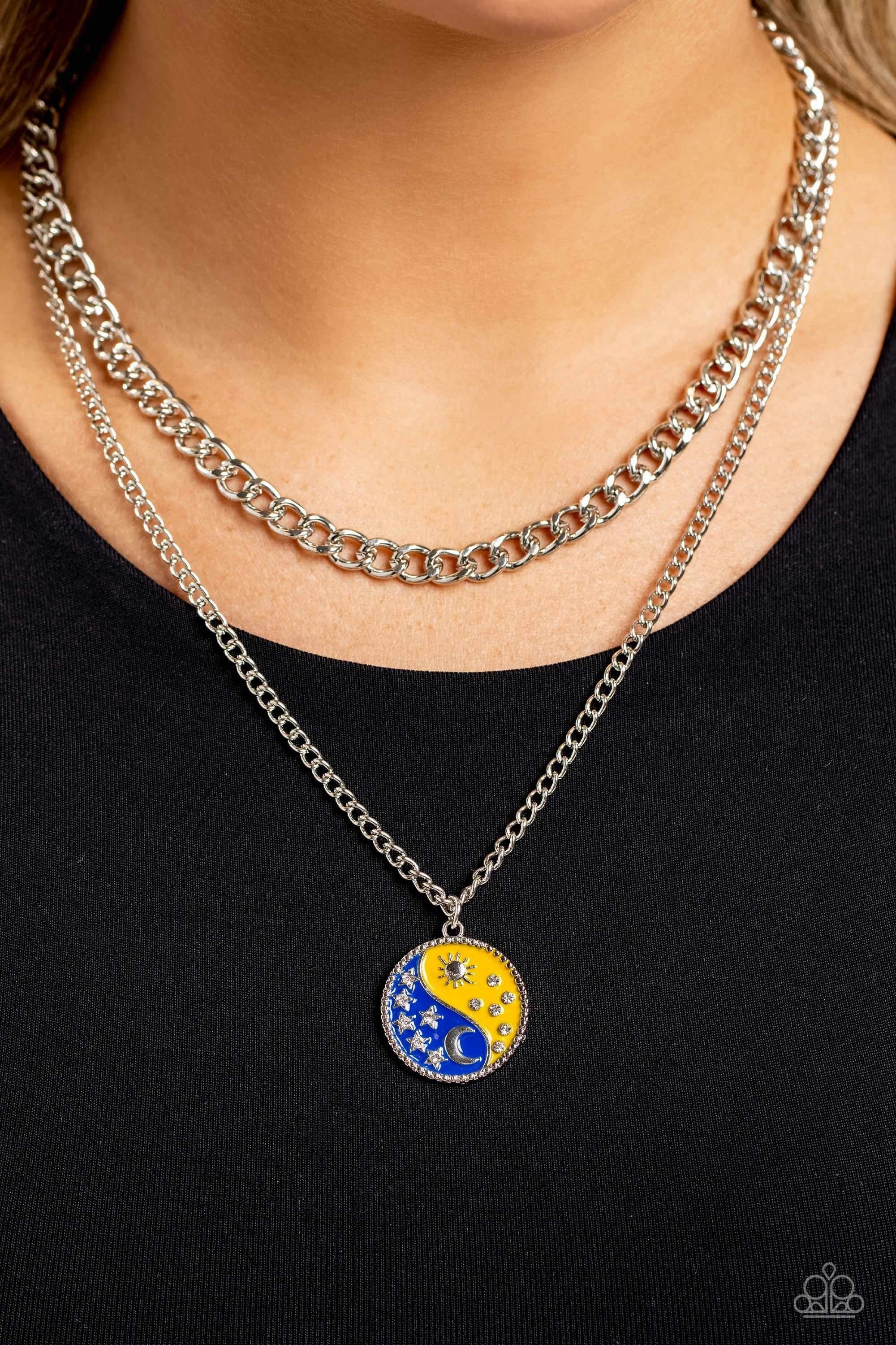 Featuring a yin-yang design, a silver moon with rhinestone-dusted stars rests on the blue curve, while a silver sun with rhinestone beams of light rests on the yellow curve for a balanced, studded display down the neckline. A silver curb chain hangs above the pendant for a touch of gritty sheen. Features an adjustable clasp closure.