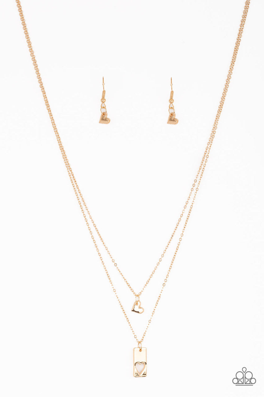 A dainty gold heart swings from the uppermost gold chain, above a rectangular pendant featuring an airy heart-shaped cutout. Features an adjustable clasp closure.
