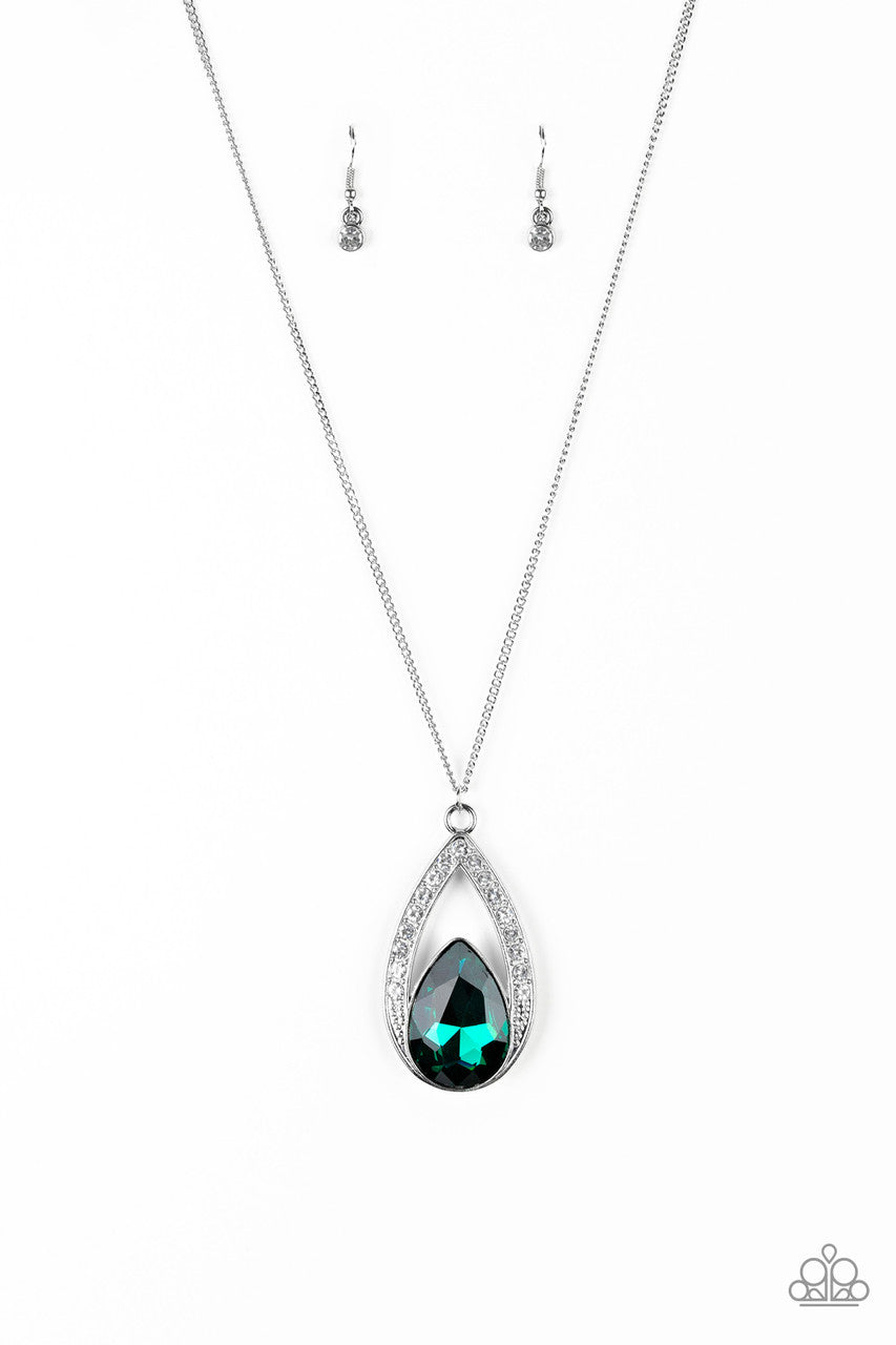 A glittery green teardrop gem is pressed into a silver frame radiating with glassy white rhinestones. The glamorous pendant swings from the bottom of a shimmery silver chain for a refined look. Features an adjustable clasp closure.