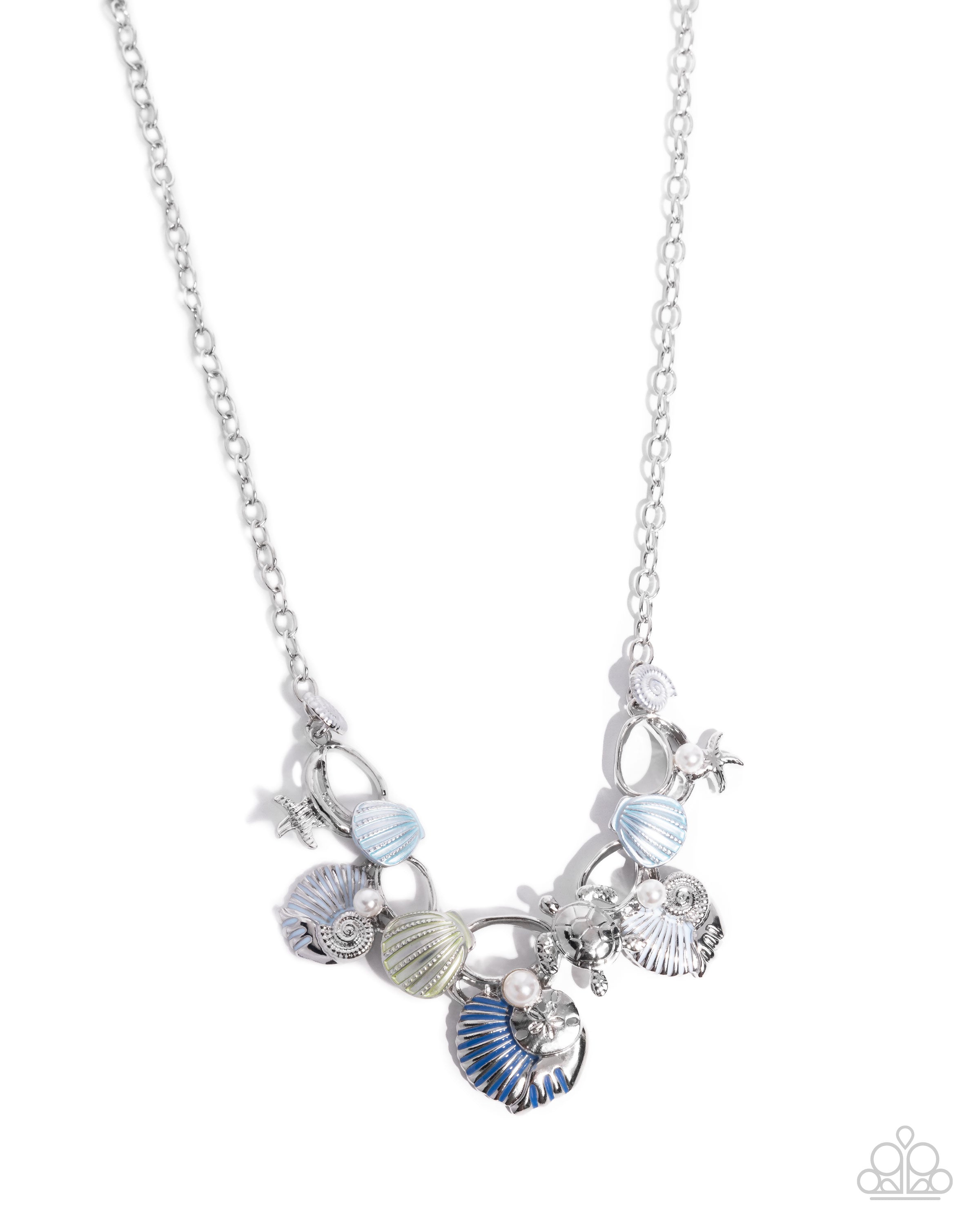 Connecting to a dainty silver cable chain, a collection of coastal details including conch shells in pearlized white, snail shells in Déja Vu Blue and Limpet Shell, seashells in Turtle Green and Limpet Shell, silver starfish, white pearls, a sand dollar, a turtle, and subtly-hammered silver rings coalesce below the neckline for an opulent oceanic display. Features an adjustable clasp closure.