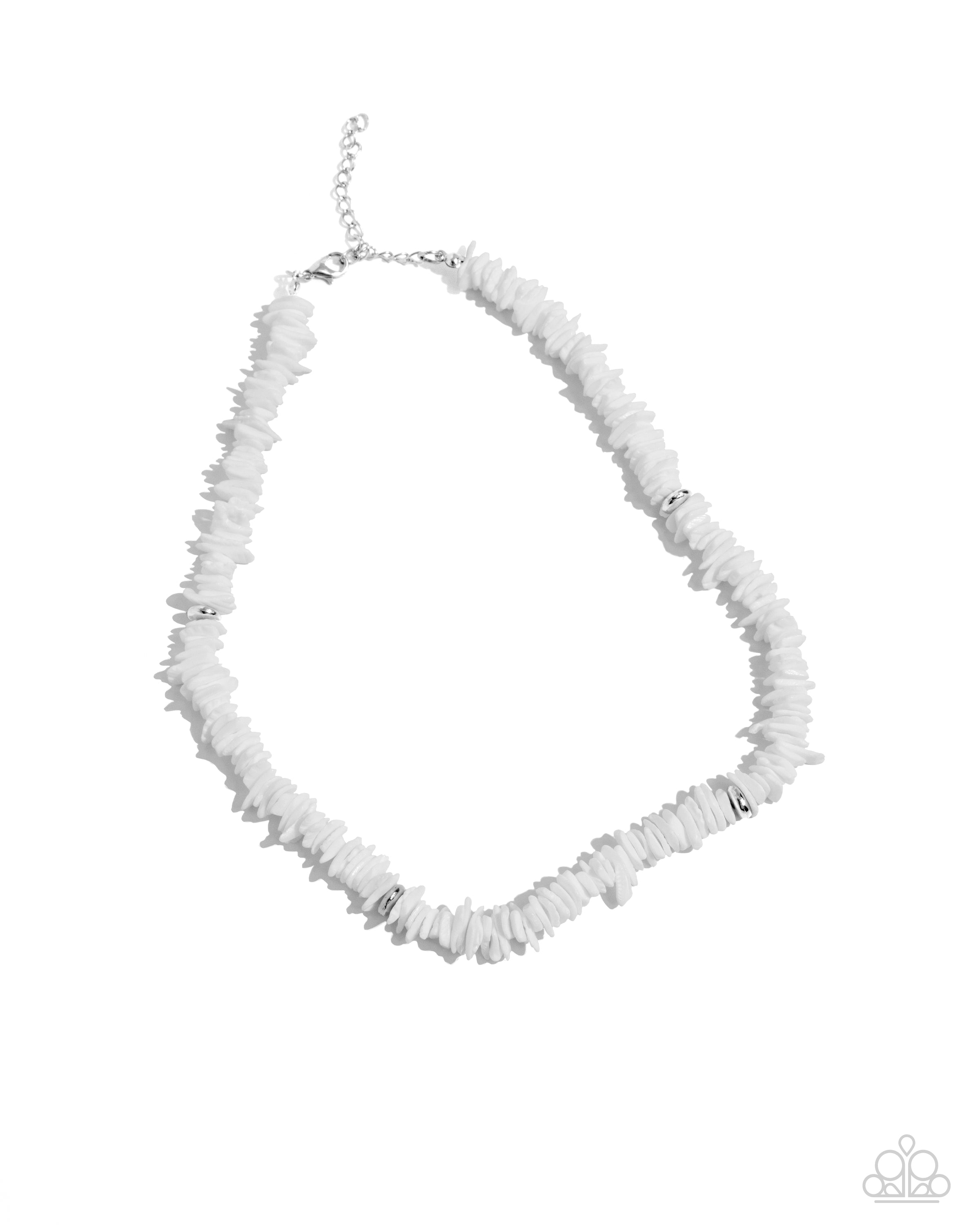 Modeled after a puka shell necklace, chiseled white shells are infused along an invisible string around the neckline with silver discs sporadically interrupting the design for a touch of monochromatic color. Features an adjustable clasp closure.