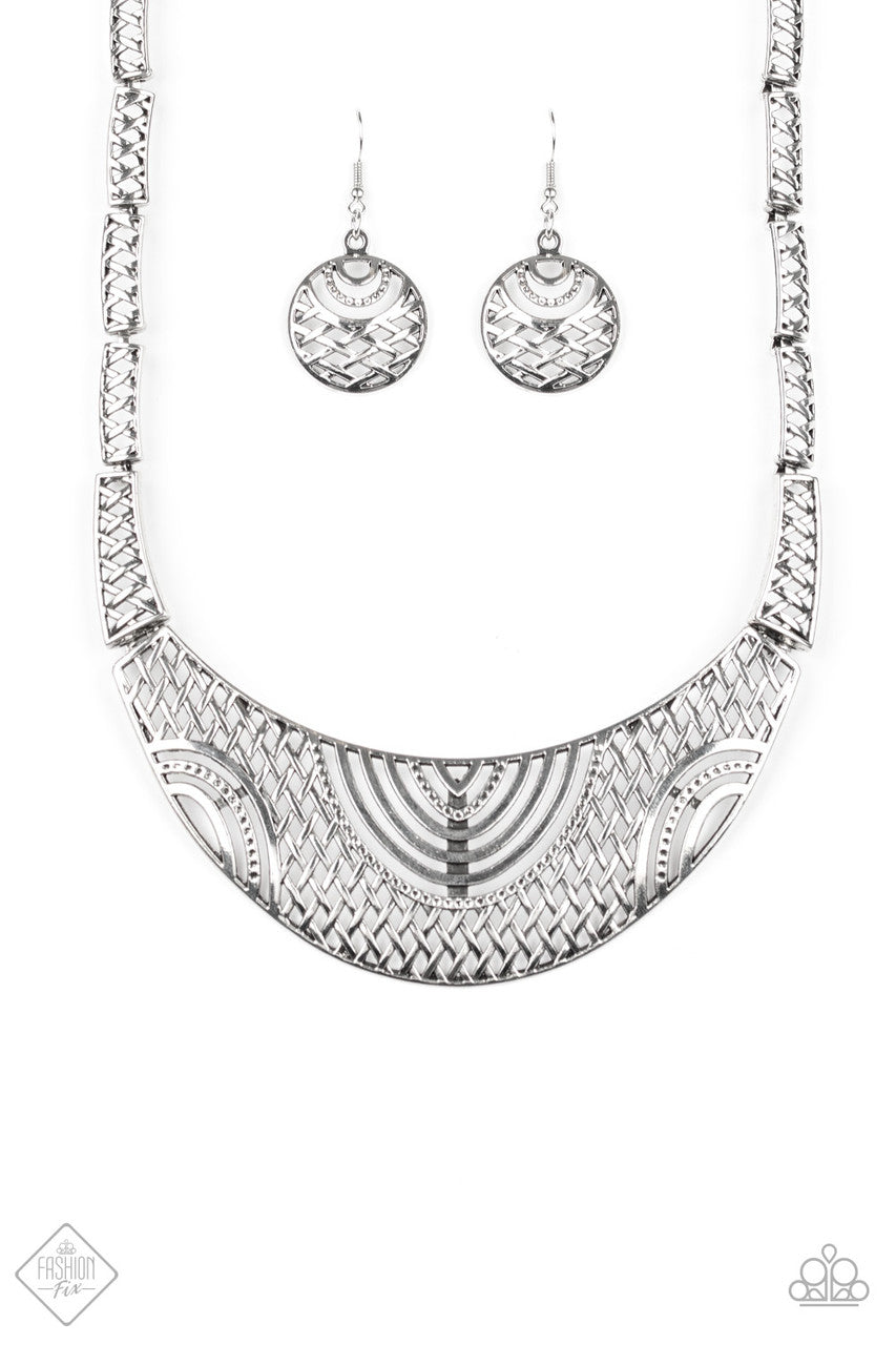 Featuring crisscrossed detail, dainty silver frames link below the collar, giving way to a dramatic half-moon plate radiating with dizzying tribal details for a fierce look. Features an adjustable clasp closure.