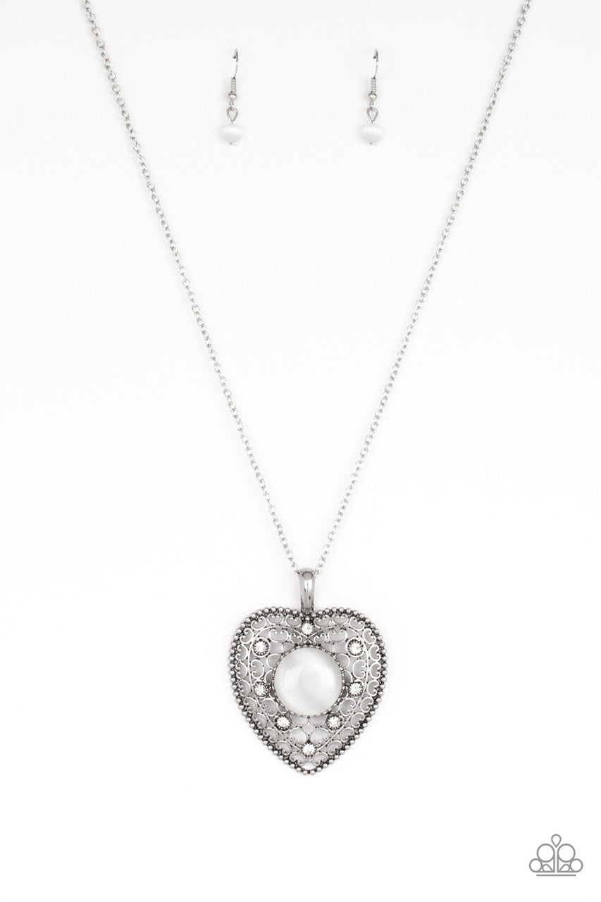 Featuring a glowing white moonstone center, an oversized heart frame radiating with silver filigree and glittery white rhinestones swings from the bottom of a lengthened silver chain for a whimsical look. Features an adjustable clasp closure.