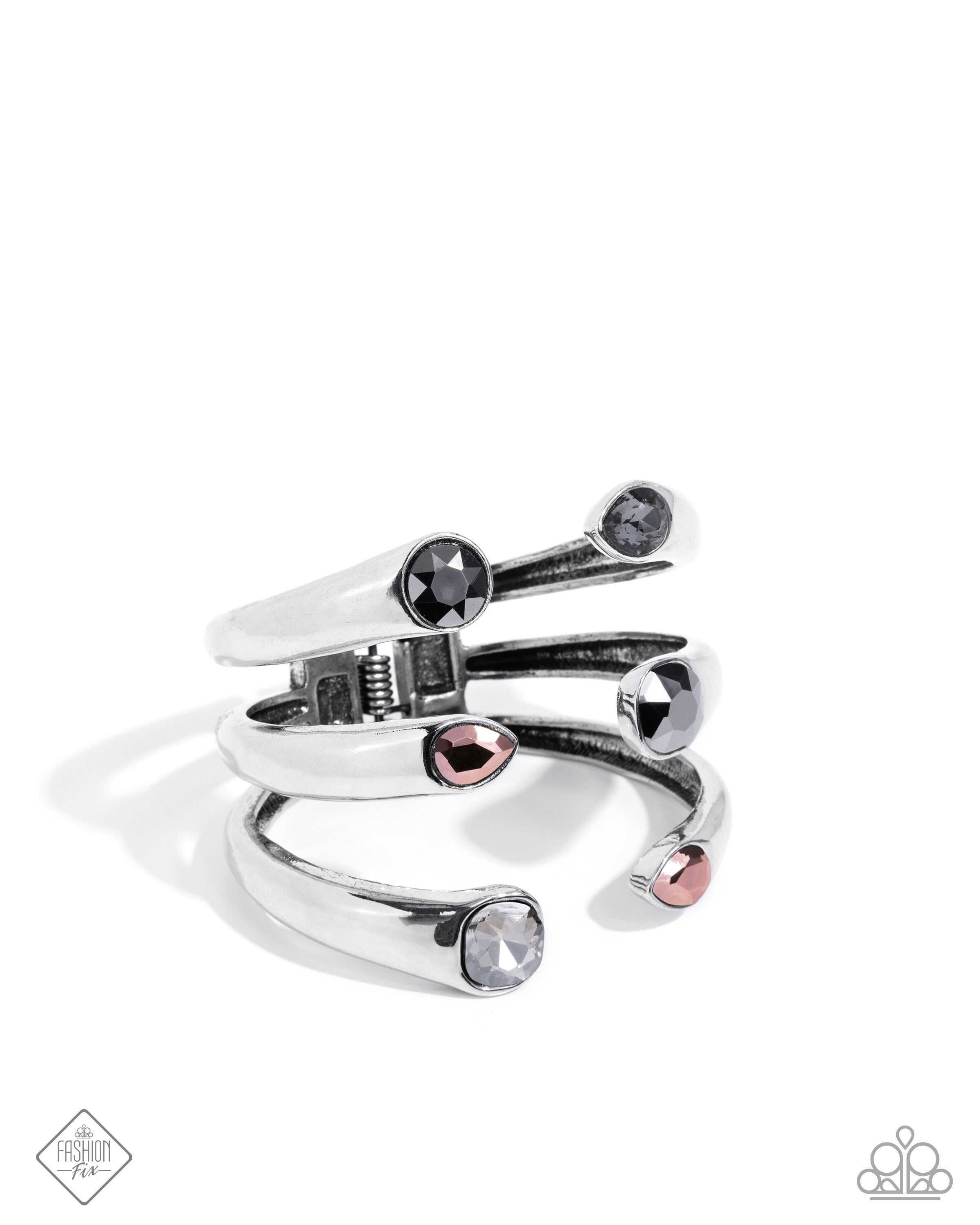 Attached to stacked airy silver bars, round, teardrop, and asscher-cut smoky, hematite, and copper aurum gems dot along the top of the wrist, creating a substantially sassy cuff. Features a hinged closure.