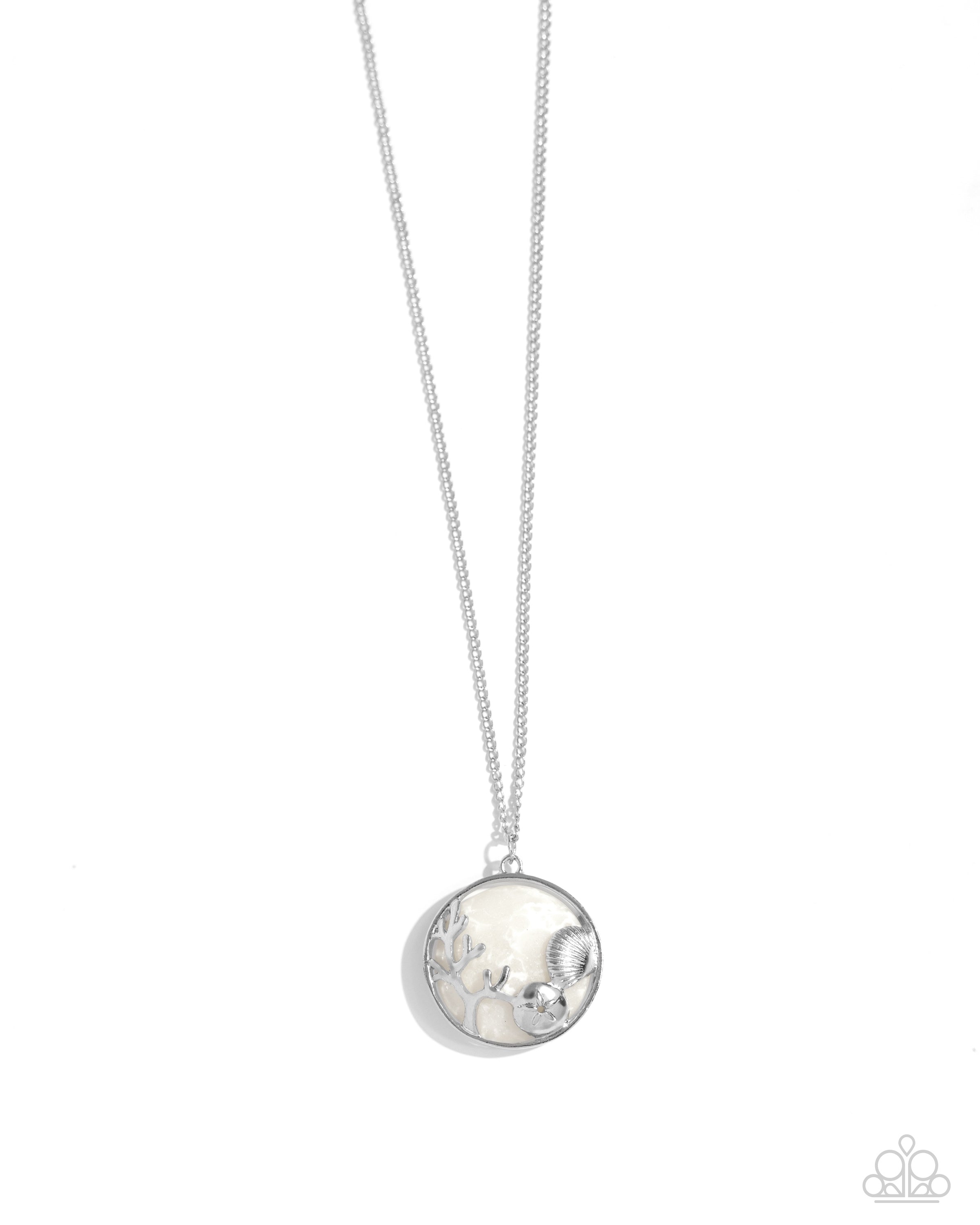 Featuring a white stone center, various silver ocean-inspired charms, including a seashell, sand dollar, and aquatic plant create a delicate overlay that connects to the silver pendant for a classy coastal display. Features an adjustable clasp closure. As the stone elements in this piece are natural, some color variation is normal.