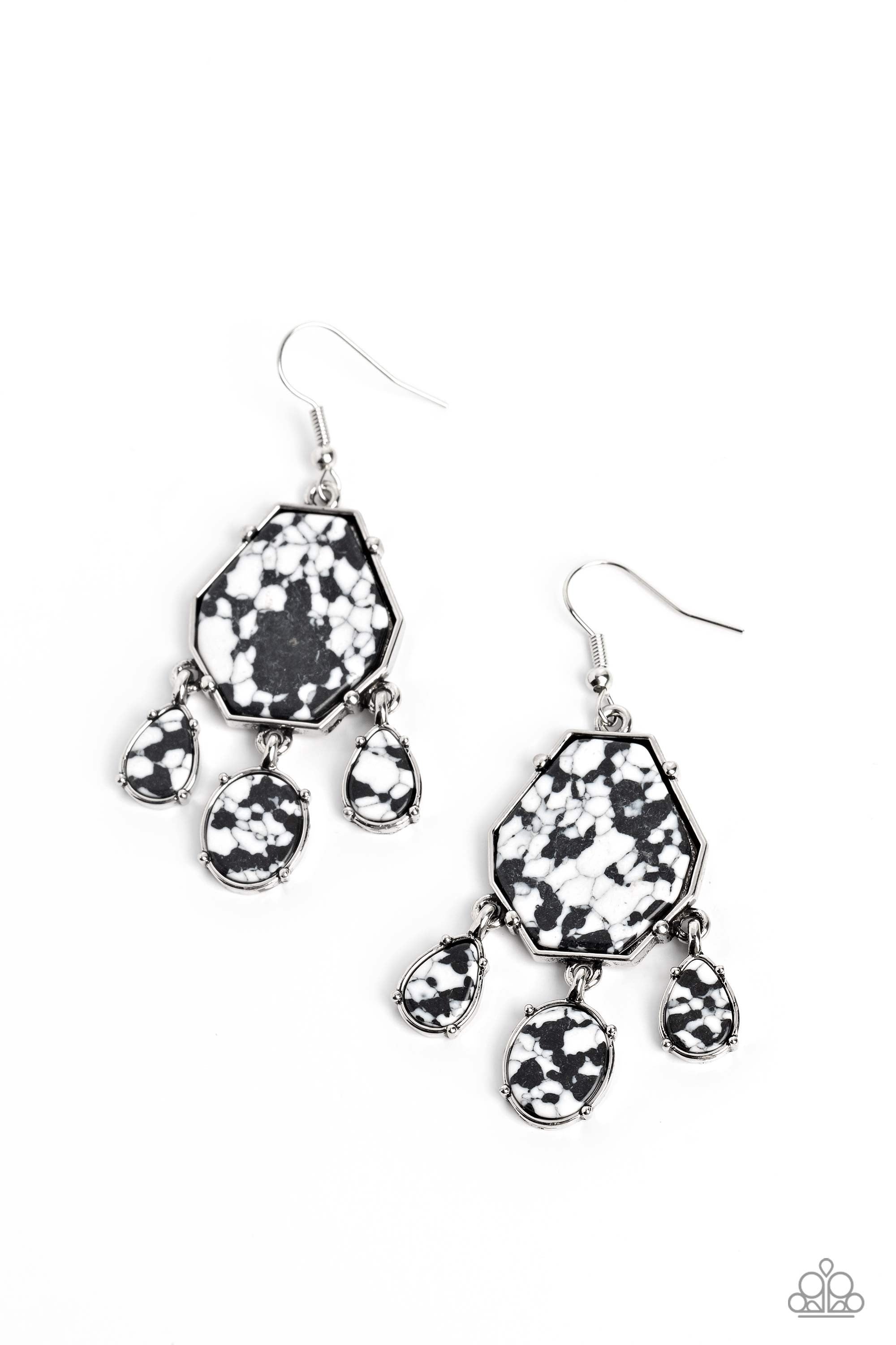 Pronged in place, a trio of oval and teardrop white stones with black marbling swings from the bottom of an elongated geometric-shaped stone in the same hue, creating an earthy fringe. Earring attaches to a standard fishhook fitting. As the stone elements in this piece are natural, some color variation is normal.