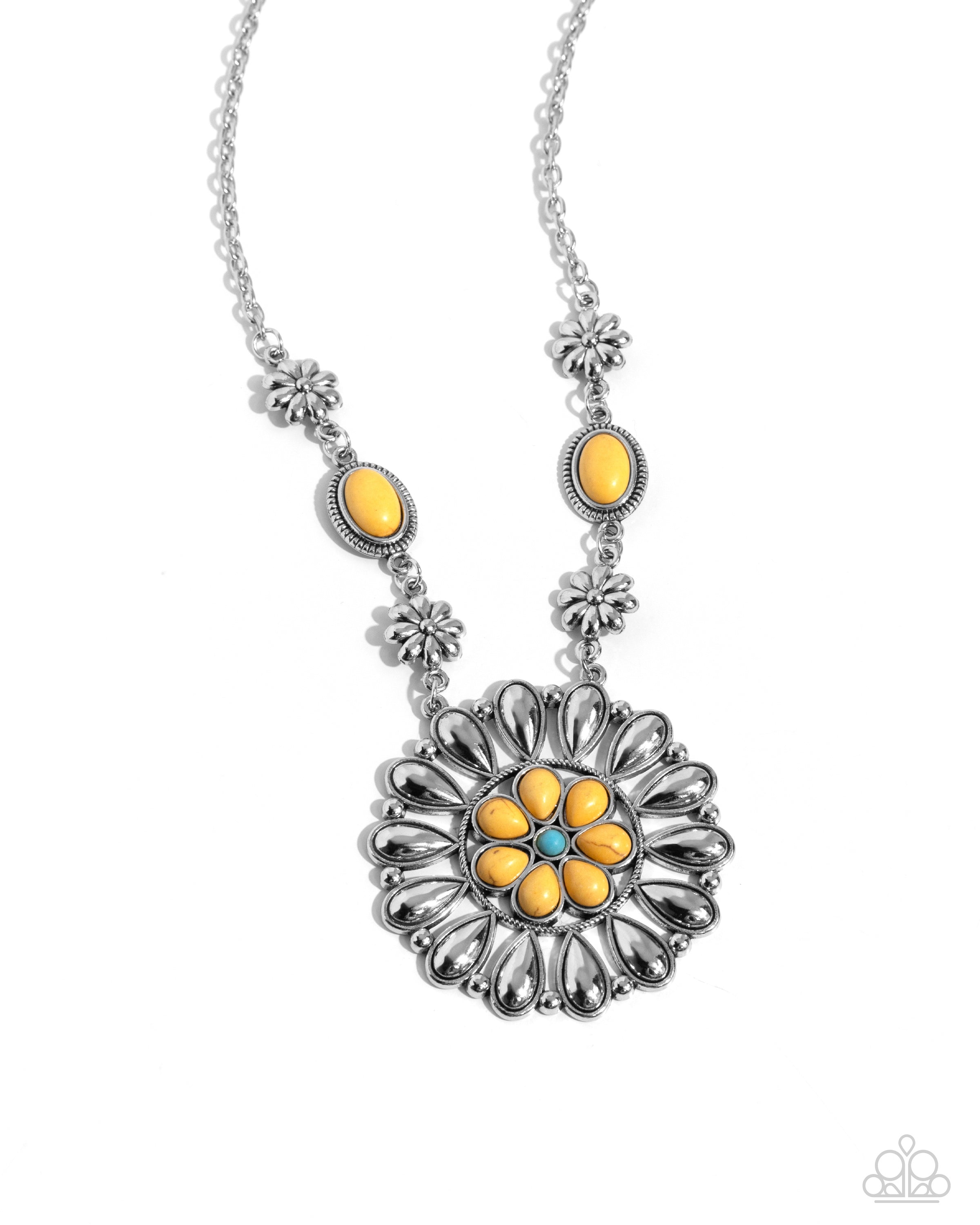 A rustic collection of silver flowers and yellow stones encased in oval studded texture delicately connects below the collar. Bordered in matching studded texture, an oversized silver and yellow stone-petaled floral pendant swings from the bottom of the earthy compilation for a seasonal fashion. A dainty turquoise stone makes up the center of the pendant for additional color. Features an adjustable clasp closure. As the stone elements in this piece are natural, some color variation is normal.