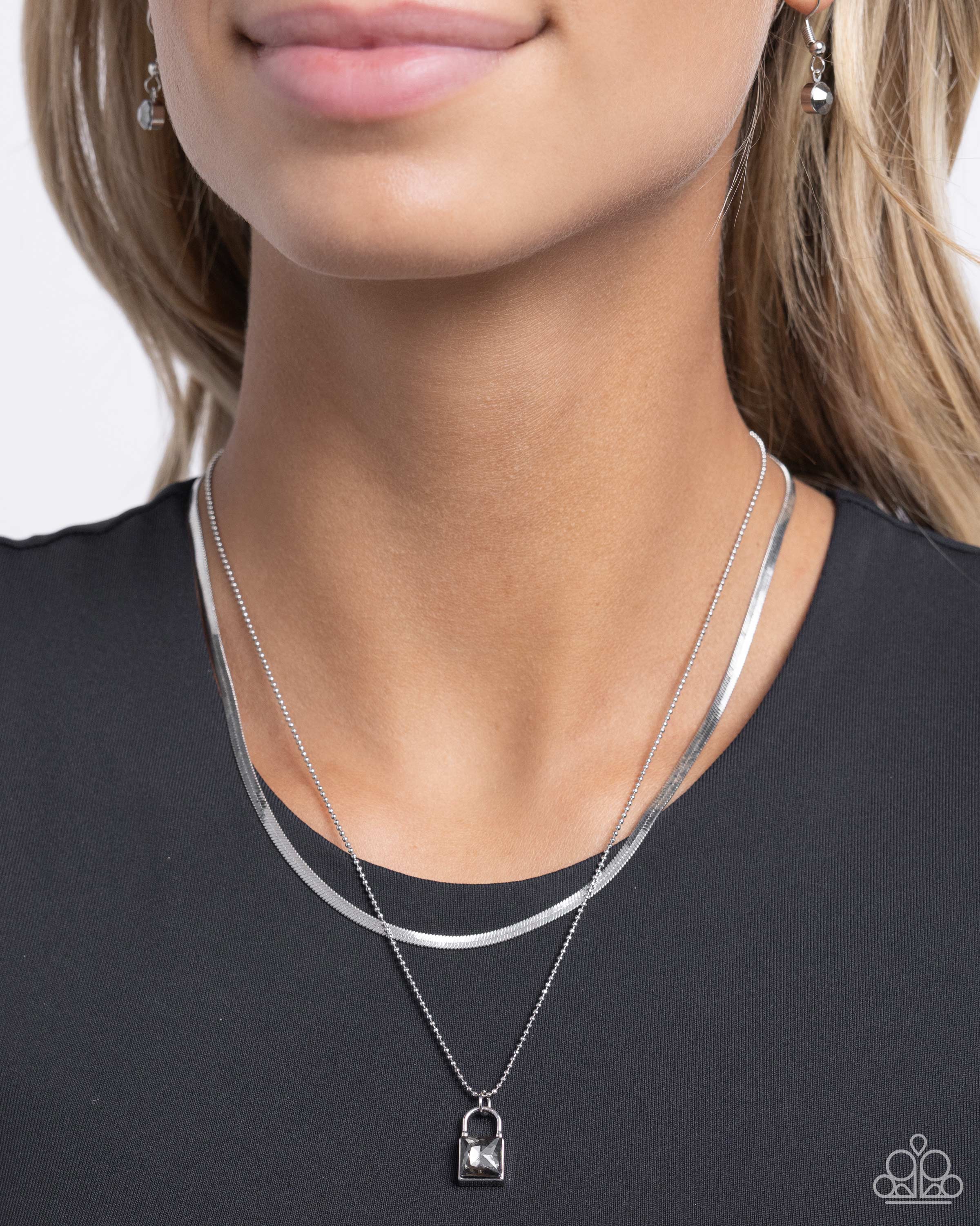 Pressed in a silver padlock pendant, a smoky square gem glistens and glides along a dainty silver ball chain. Layered above the gritty glittery display, a silver herringbone chain creates additional edge and detail. Features an adjustable clasp closure.