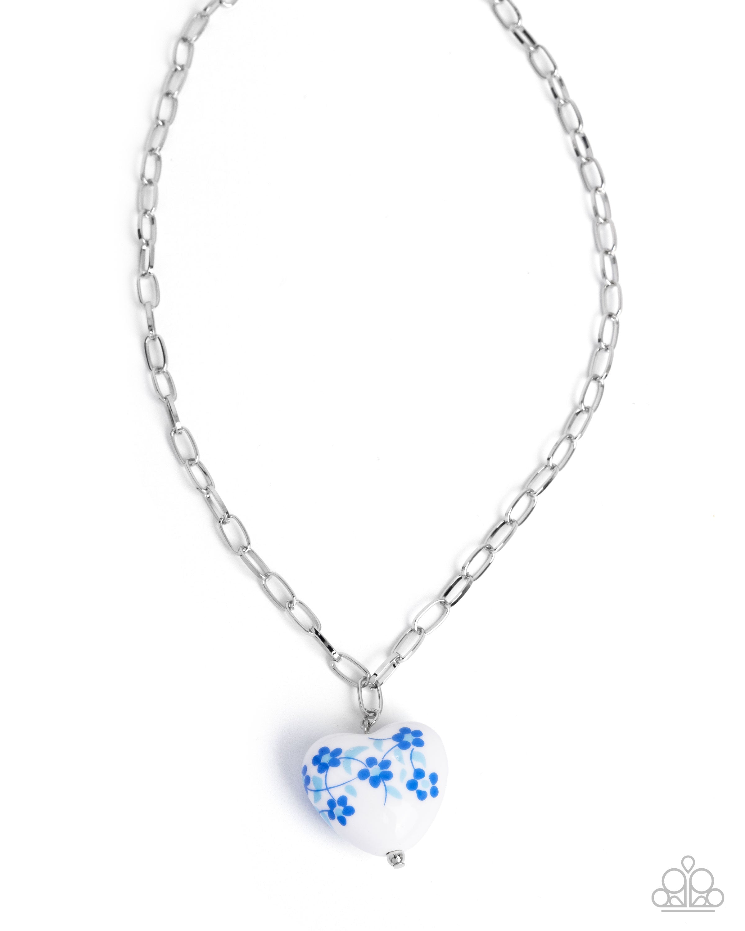 Modeled after porcelain, a delicately painted white heart with a Deja Vu Blue floral pattern across its center sways below the neckline from a y-shaped silver paperclip chain for a heartfelt, handmade statement. Features an adjustable clasp closure.