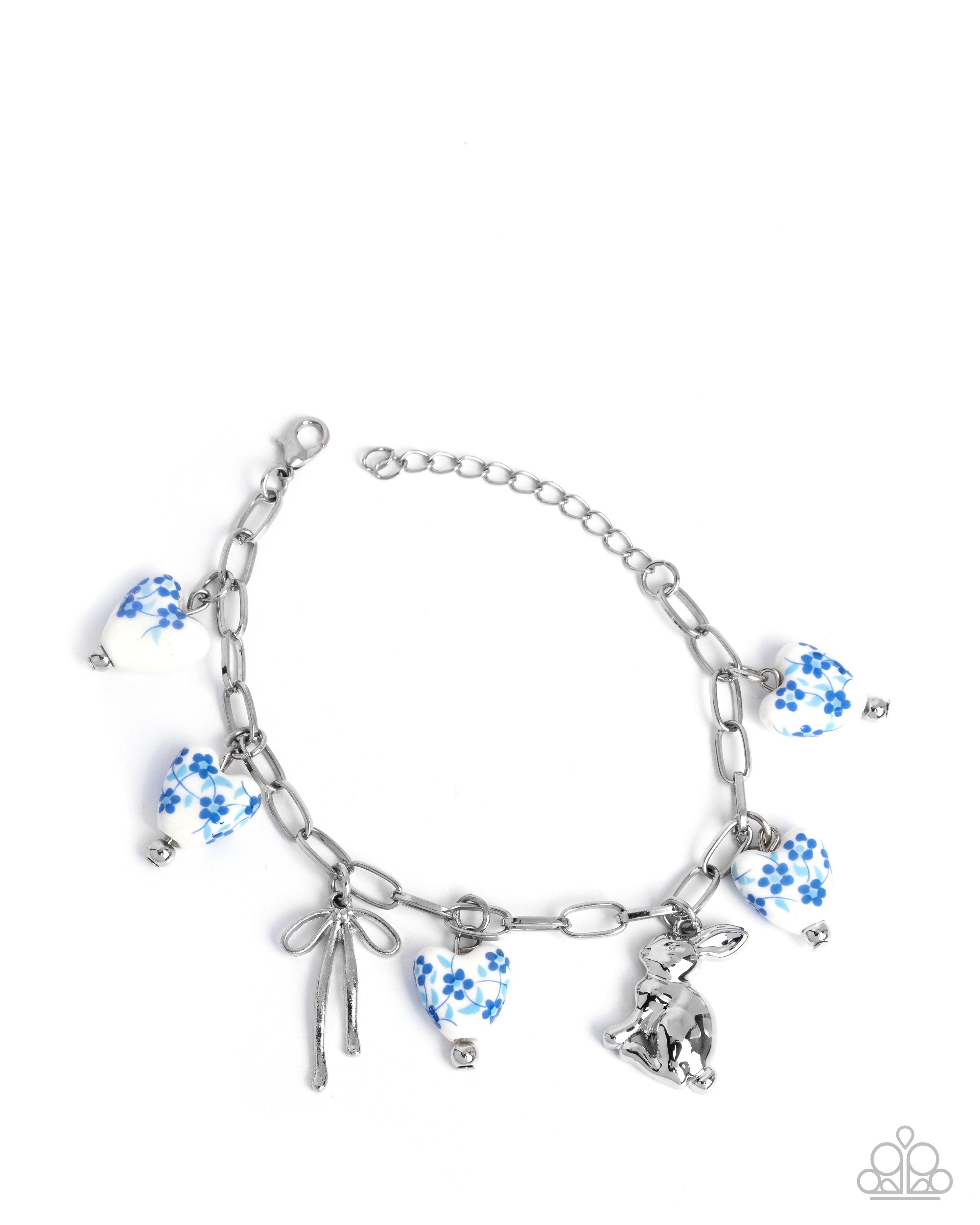 Modeled after porcelain, a collection of slightly pinched delicately painted white hearts with a Déja Vu Blue floral pattern across their centers sway beside a silver rabbit and a silver bow around the wrist from a silver paperclip chain for a heartfelt, handmade statement. Features an adjustable clasp closure.