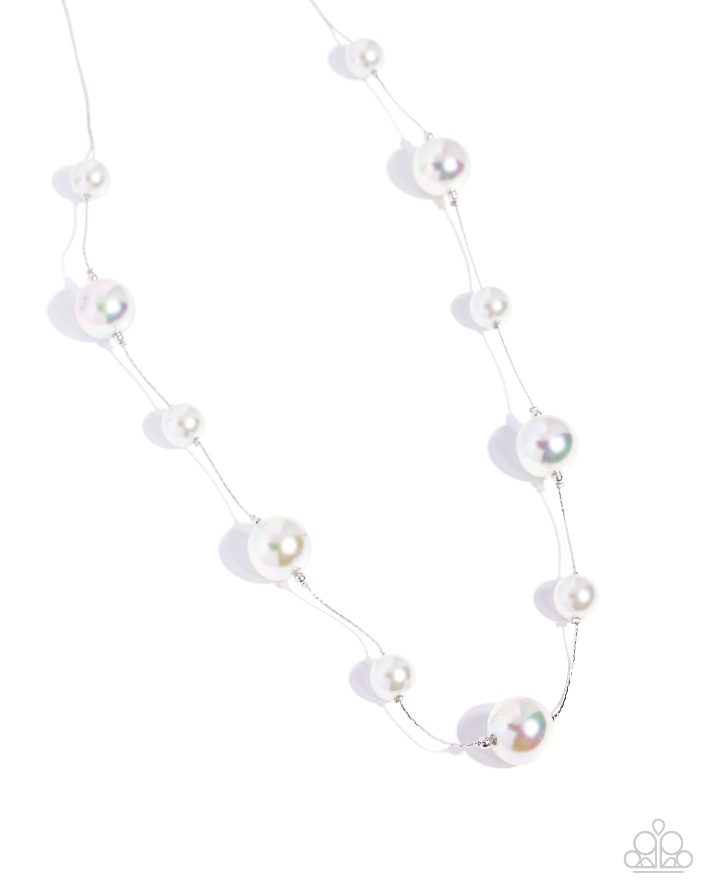 Brushed in iridescence, light gray pearls in varying sizes are threaded along a dainty silver wire below the neckline for an elegantly, elevated look. Features an adjustable clasp closure. Due to its prismatic palette, color may vary.