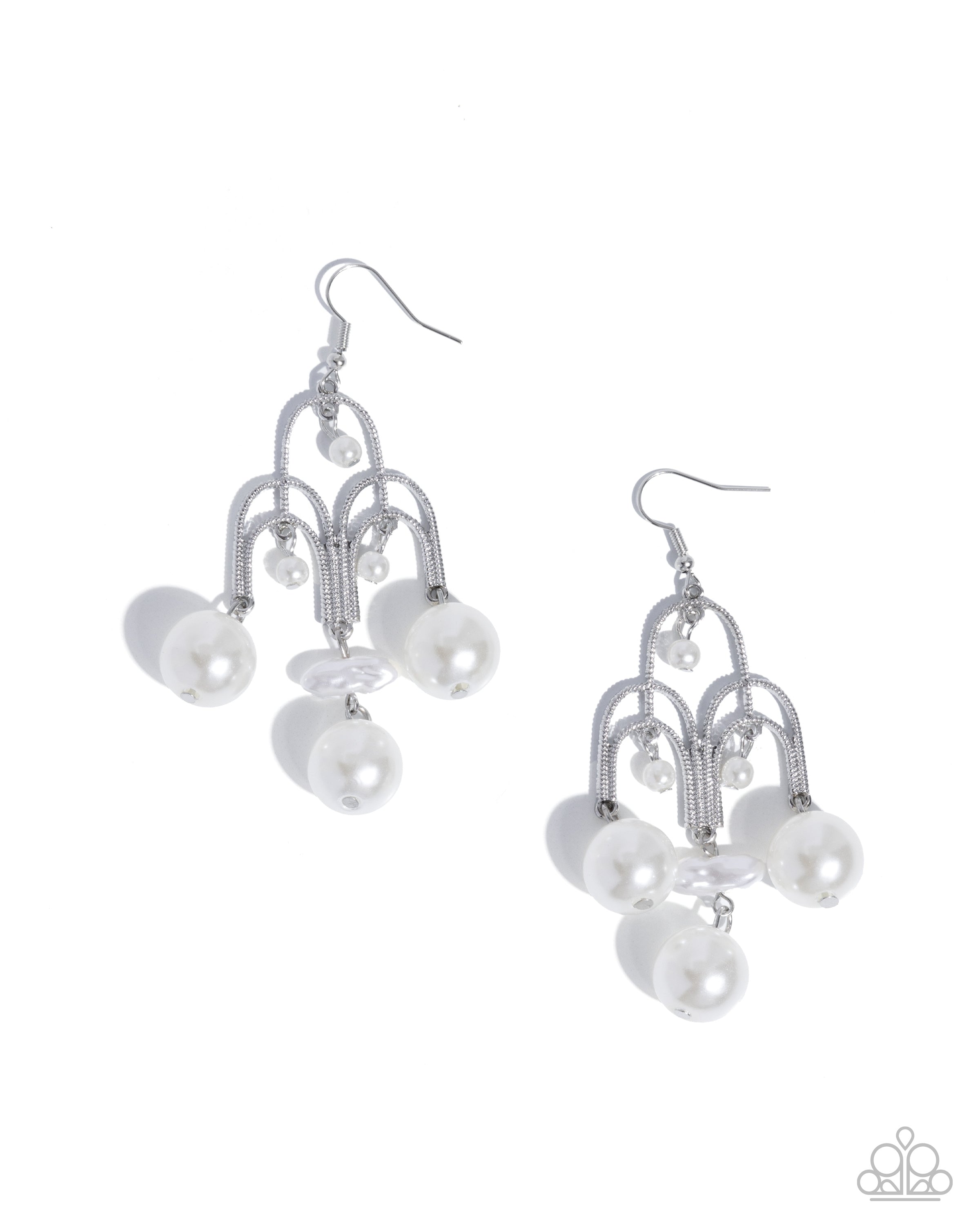 Glossy oversized white pearls, dainty round pearls, and a baroque white pearl trickle from the bottom of silver twist-textured upside-down arched silver layered frames, creating a posh-inspired chandelier. Earring attaches to a standard fishhook fitting.
