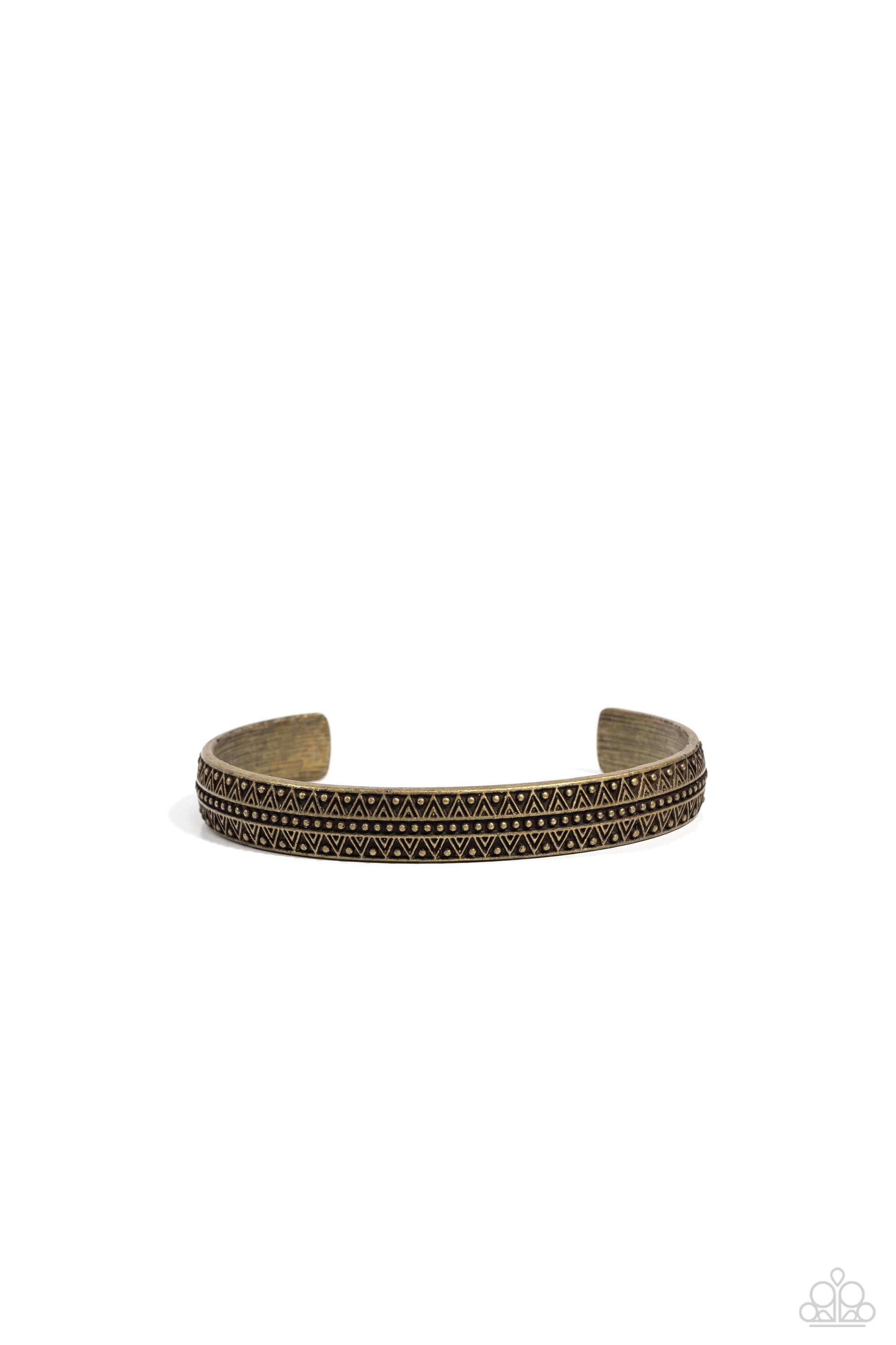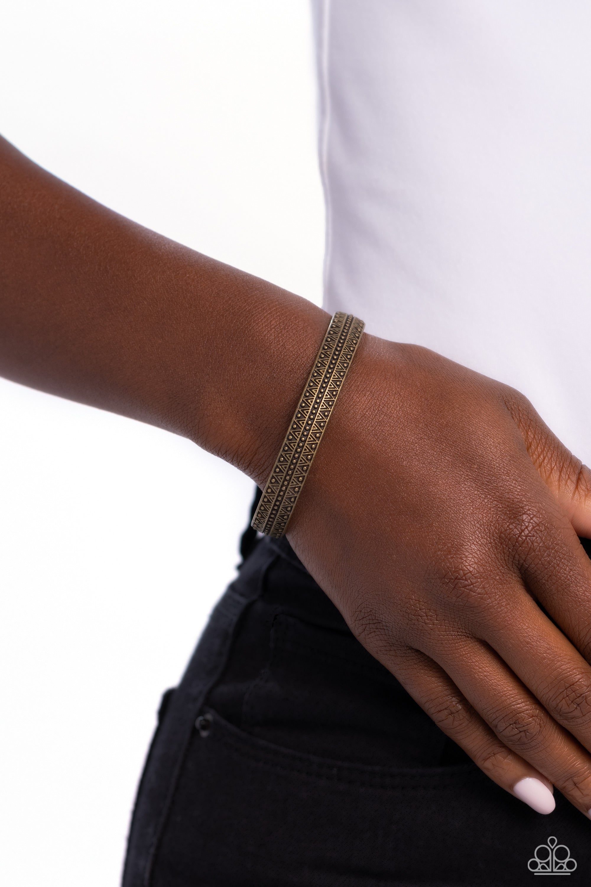 Embossed and studded in geometric patterns, an antiqued brass cuff curls across the wrist for a dainty look.