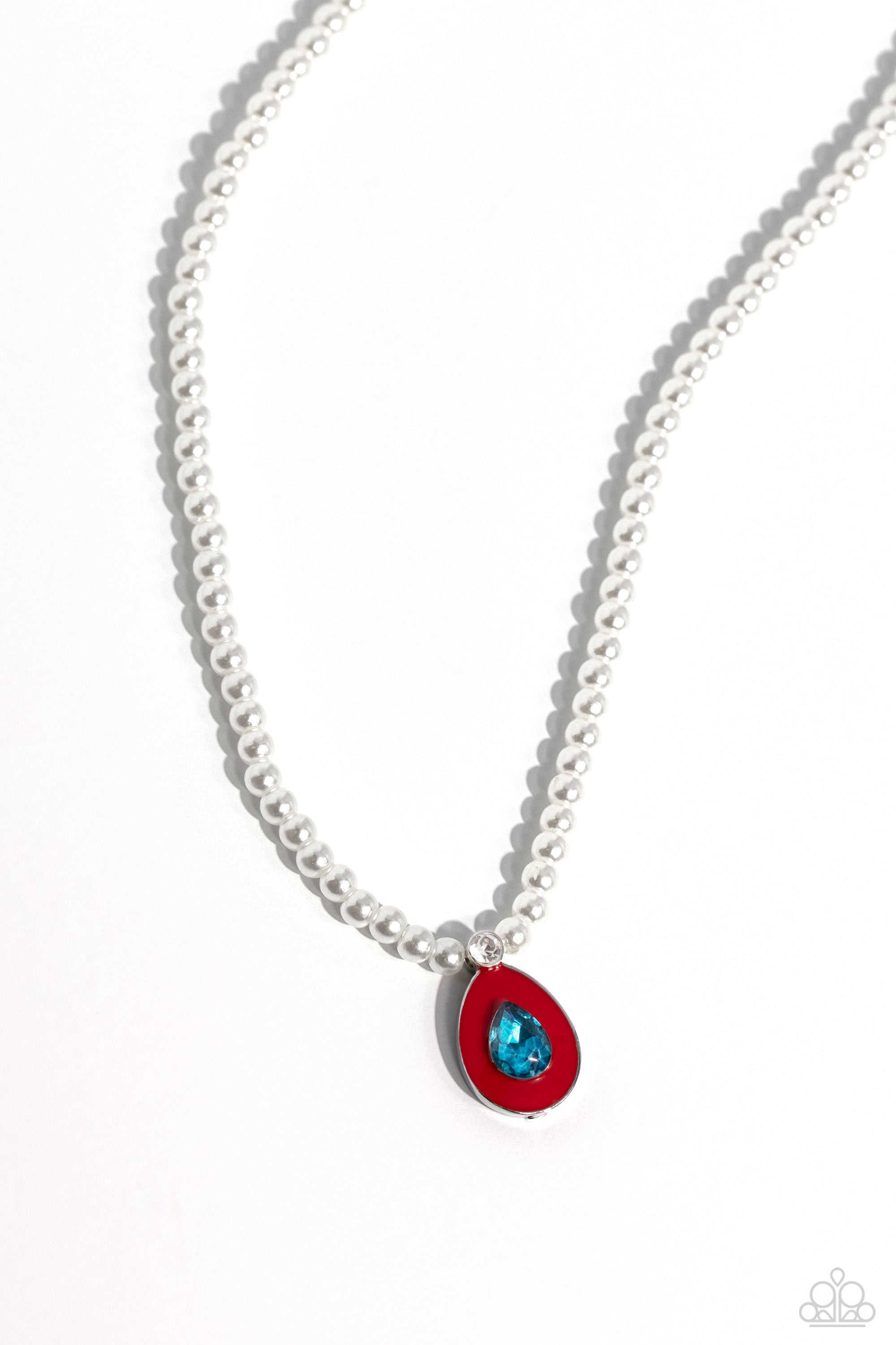 Attached to a strand of gleaming dainty white pearls, a Montana gem, bordered by red paint and a white rhinestone fitting, swings below the collar for a refined pop of color. Features an adjustable clasp closure.