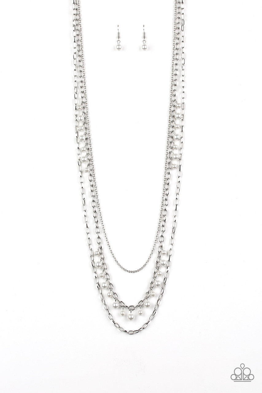 Three mismatched silver chains layer down the chest. Dainty gray pearls cascade down one silver chain, adding a flirty twist to the timeless pearl palette. Features an adjustable clasp closure.
