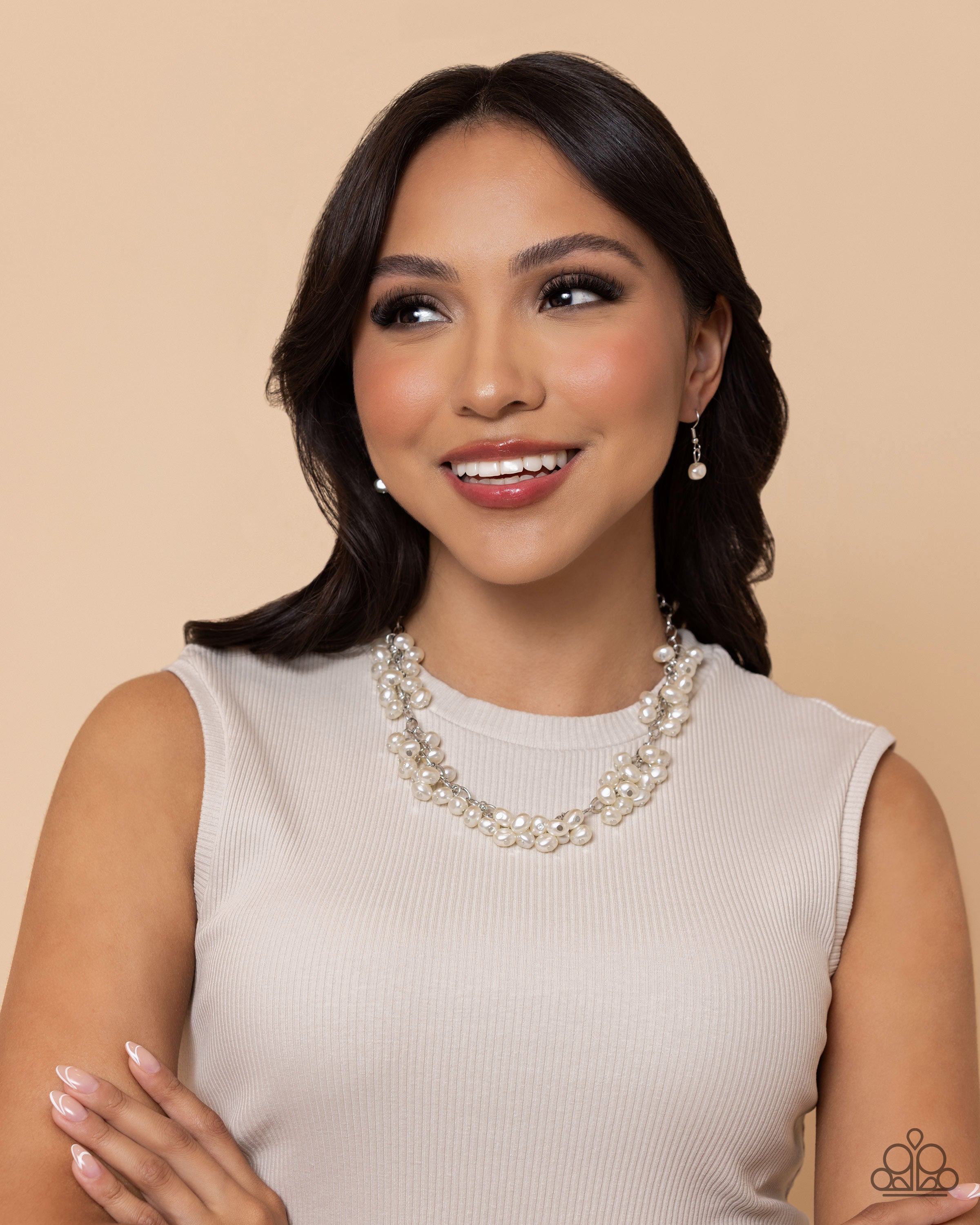 A cascade of white pearly beads dangle from a high-sheen silver, oval linked chain. The pearly beads cluster across the neckline, creating a refined pop of color. Features an adjustable clasp closure.