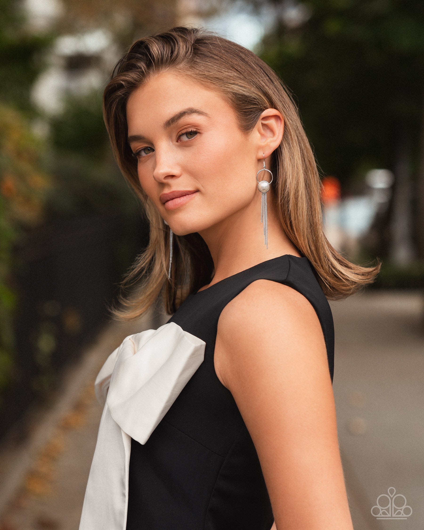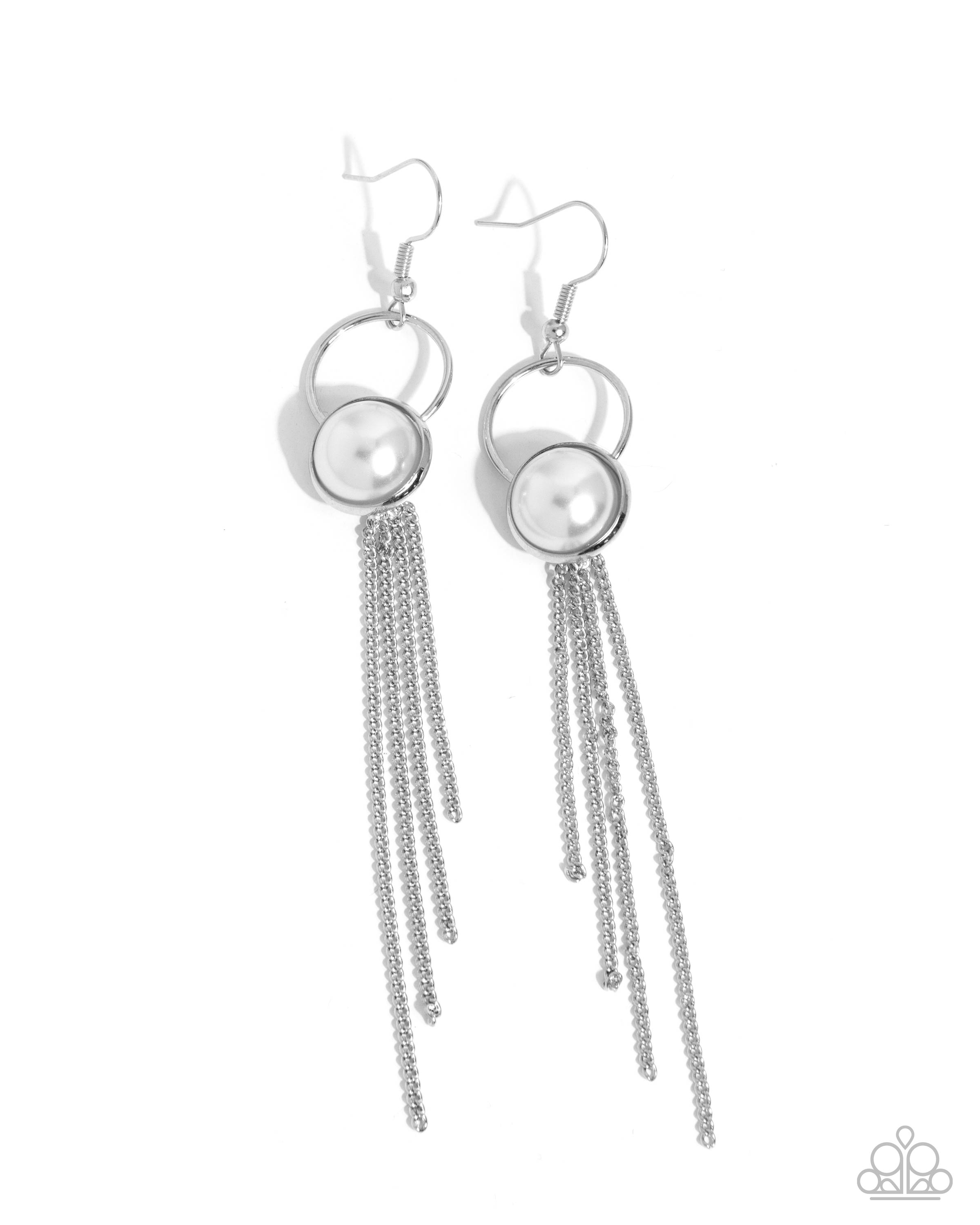 Pressed in a silver frame, a half-circle white pearl is infused along the bottom of a glistening silver hoop, giving way to a tapered tassel of dainty silver chains for a rebelliously refined lure. Earring attaches to a standard fishhook fitting.