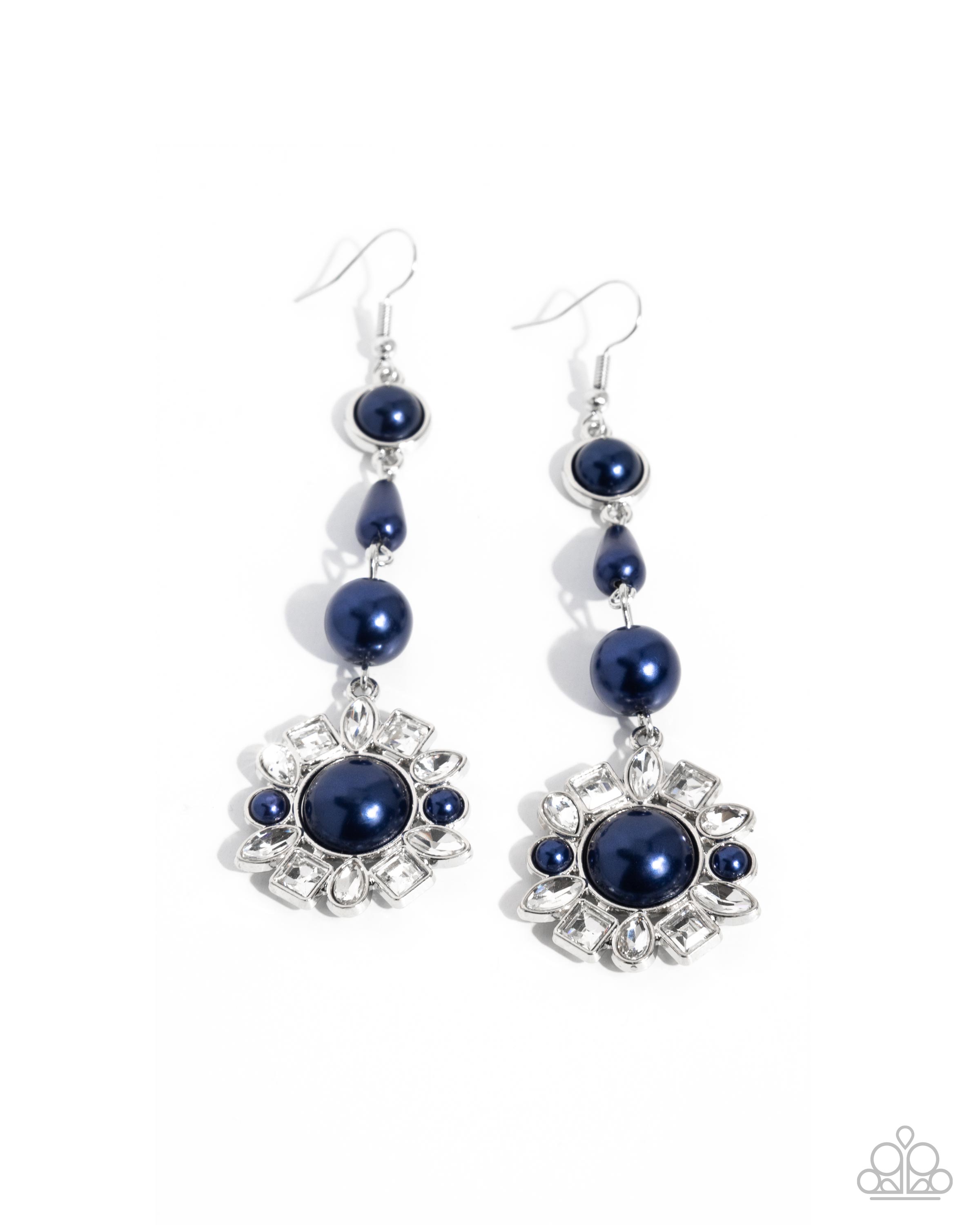 Pressed in a silver fitting, a half Montana pearl stands out below the ear, giving way to a teardrop and round Montana pearl, finally giving way to a Montana pearl floral-inspired pendant with petals of additional Montana pearls and white gems in marquise-cut, teardrop, and square cuts for a radiantly refined lure. Earring attaches to a standard fishhook fitting.