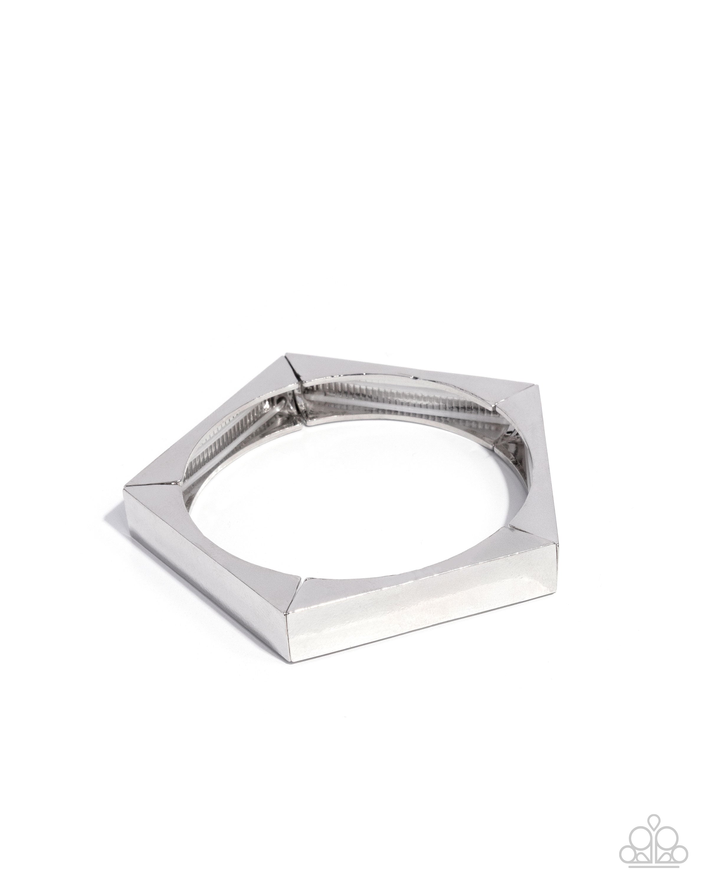 Featuring a sleek, high-sheen finish, thick silver bars curve into a pentagon around the wrist along elastic stretchy bands, creating a cutting-edge, confident centerpiece.