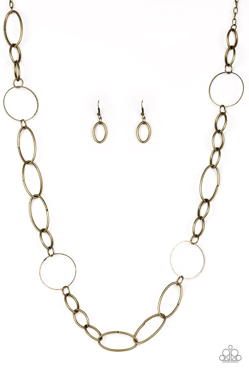 An array of smooth and textured brass hoops connect across the chest, creating a bold mismatched palette. Features an adjustable clasp closure.