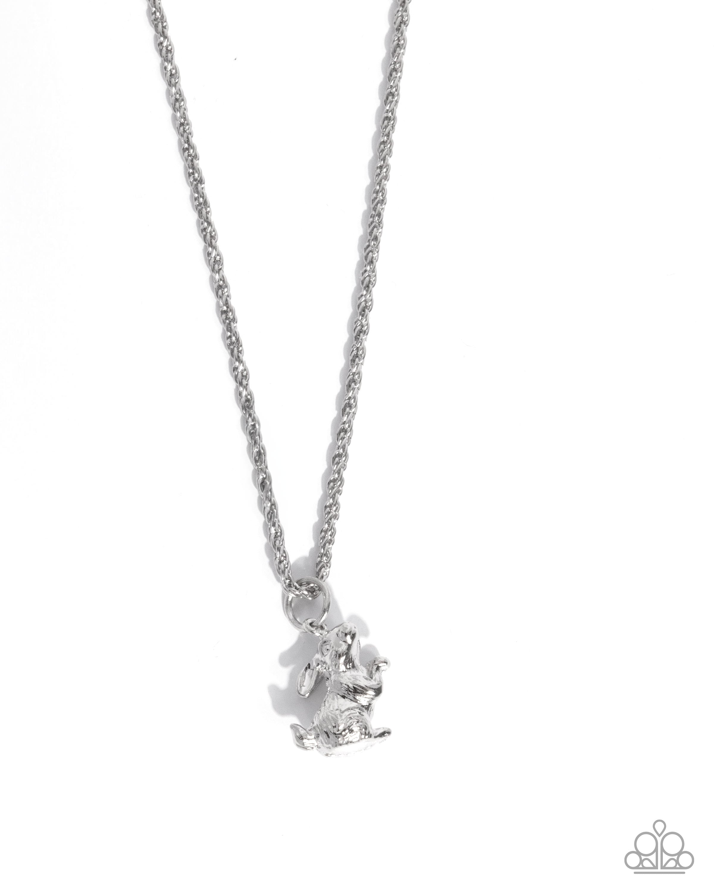 A shiny silver rope chain, adorned with an intricately detailed silver rabbit pendant, sits playfully below the collar. Features an adjustable clasp closure.