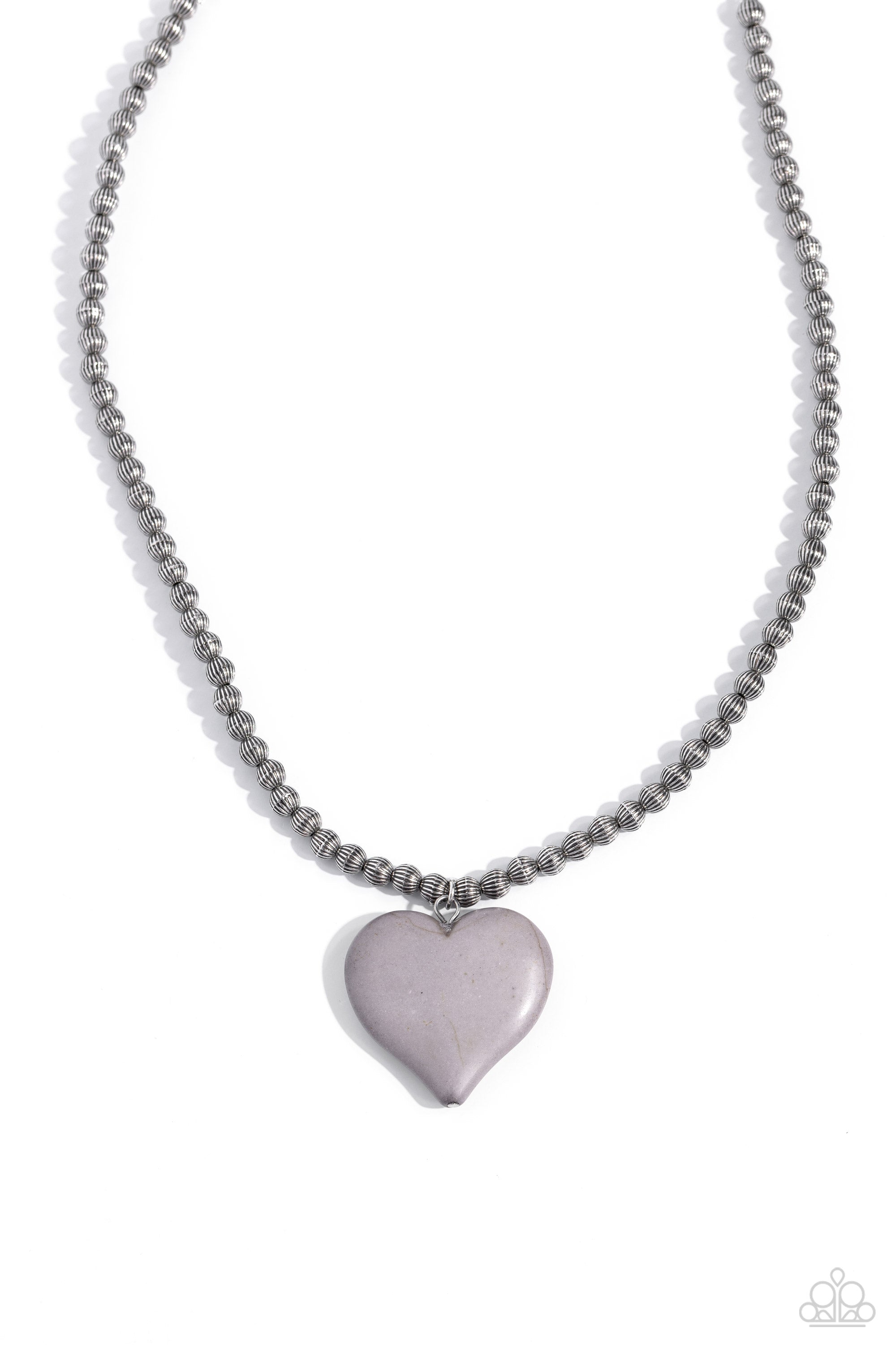 An oversized gray stone heart pendant swings from the bottom of a textured silver beaded display below the collar for a flirtatiously earthy fashion. Features an adjustable clasp closure. As the stone elements in this piece are natural, some color variation is normal.