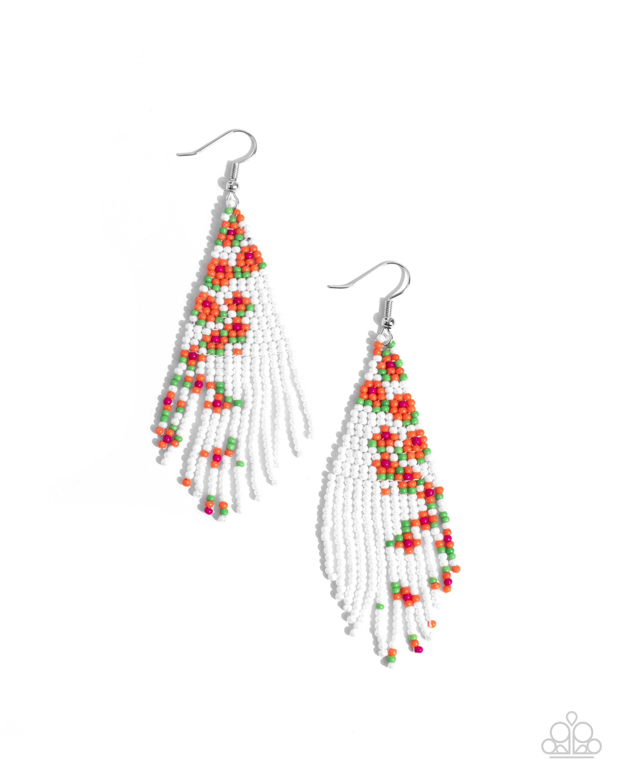 Strands of white, green, orange, and fuchsia seed beads colorfully weave into a vivaciously floral beaded fringe that tapers below the ear. Earring attaches to a standard fishhook fitting.