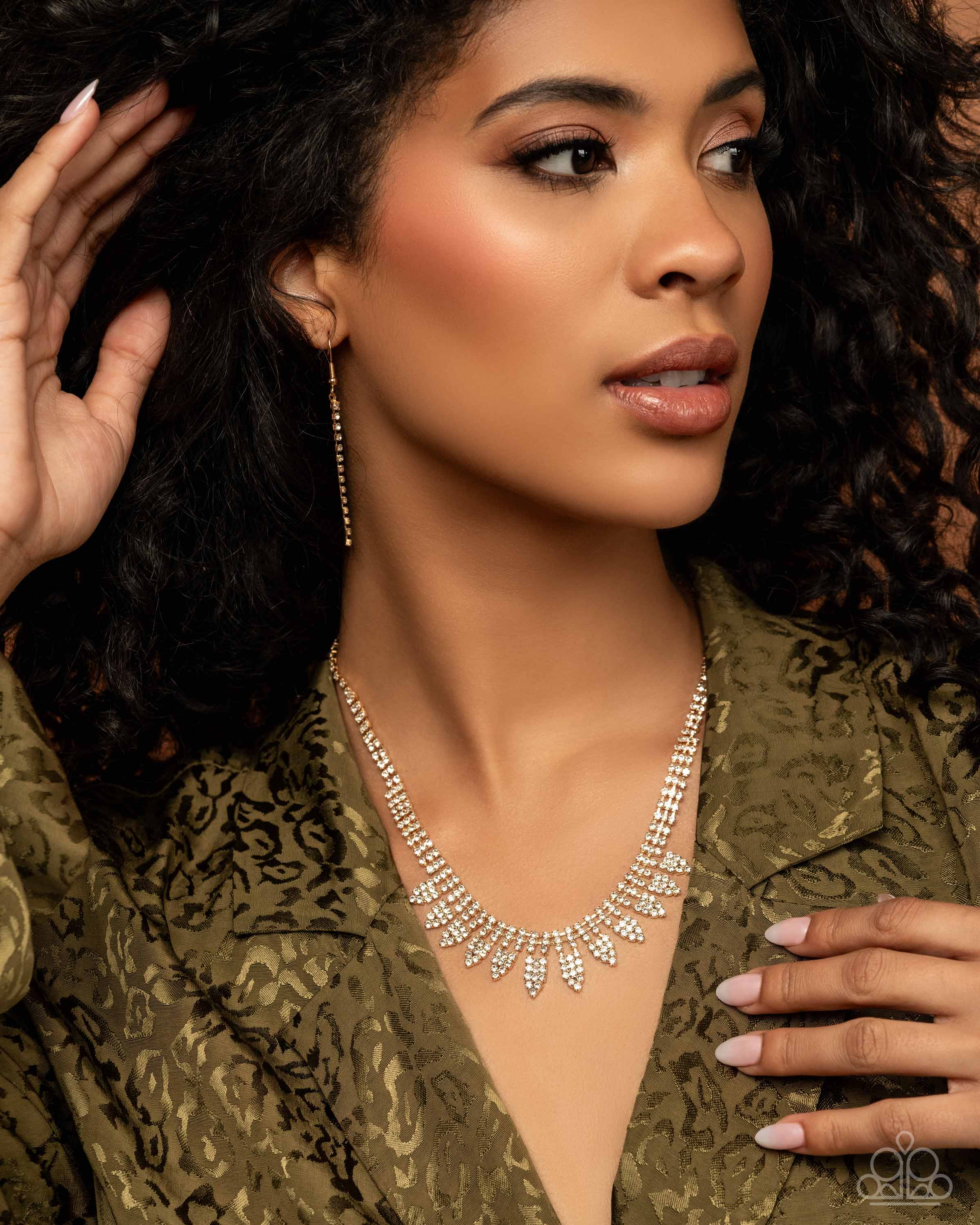 A single strand of dainty white rhinestones in gold square fittings leads down the neckline to a doubled strand of rhinestones in the same square fittings. A third row is added as the gems make their way to the centermost point of the design, creating a sparkling display. Spade-like frames embellished in dainty white rhinestones drip from the dazzling rows above, swinging down the chest in a ritzy finish. Features an adjustable clasp closure.
