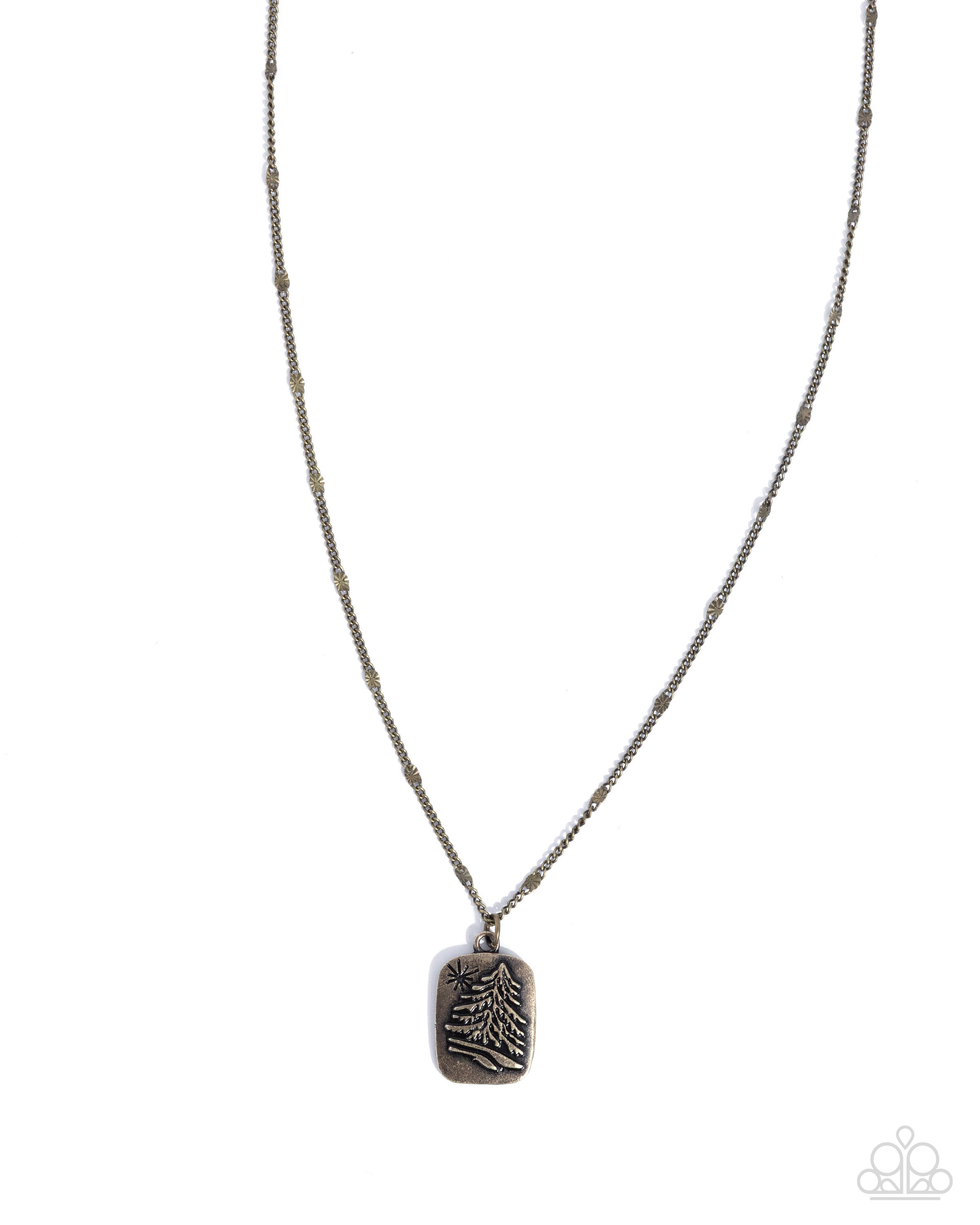 Gliding along a crimped brass satellite chain, a rounded rectangular pendant proudly displays an elaborate, textured brass pine tree amidst a solitaire star-filled sky and a brass snowy ground for a winter-chic display. Features an adjustable clasp closure.