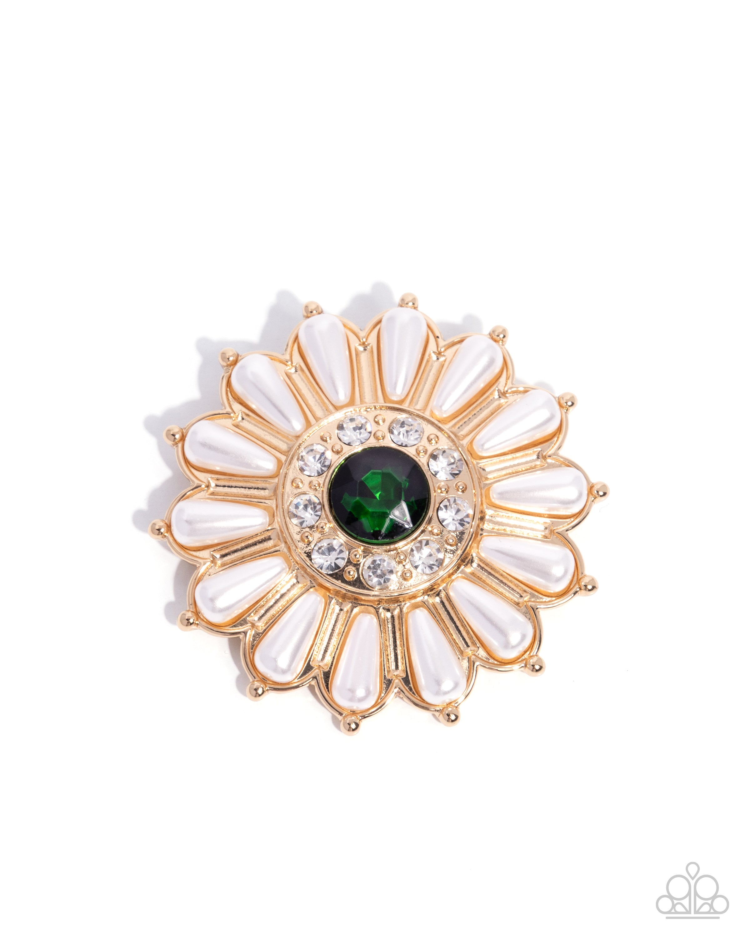 Featuring a white rhinestone-embellished border, a collection of teardrop white pearl petals encircles an emerald gem center for a fabulous floral centerpiece. Brooch measures approximately 2 1/4" in length and 2 1/4" in width.