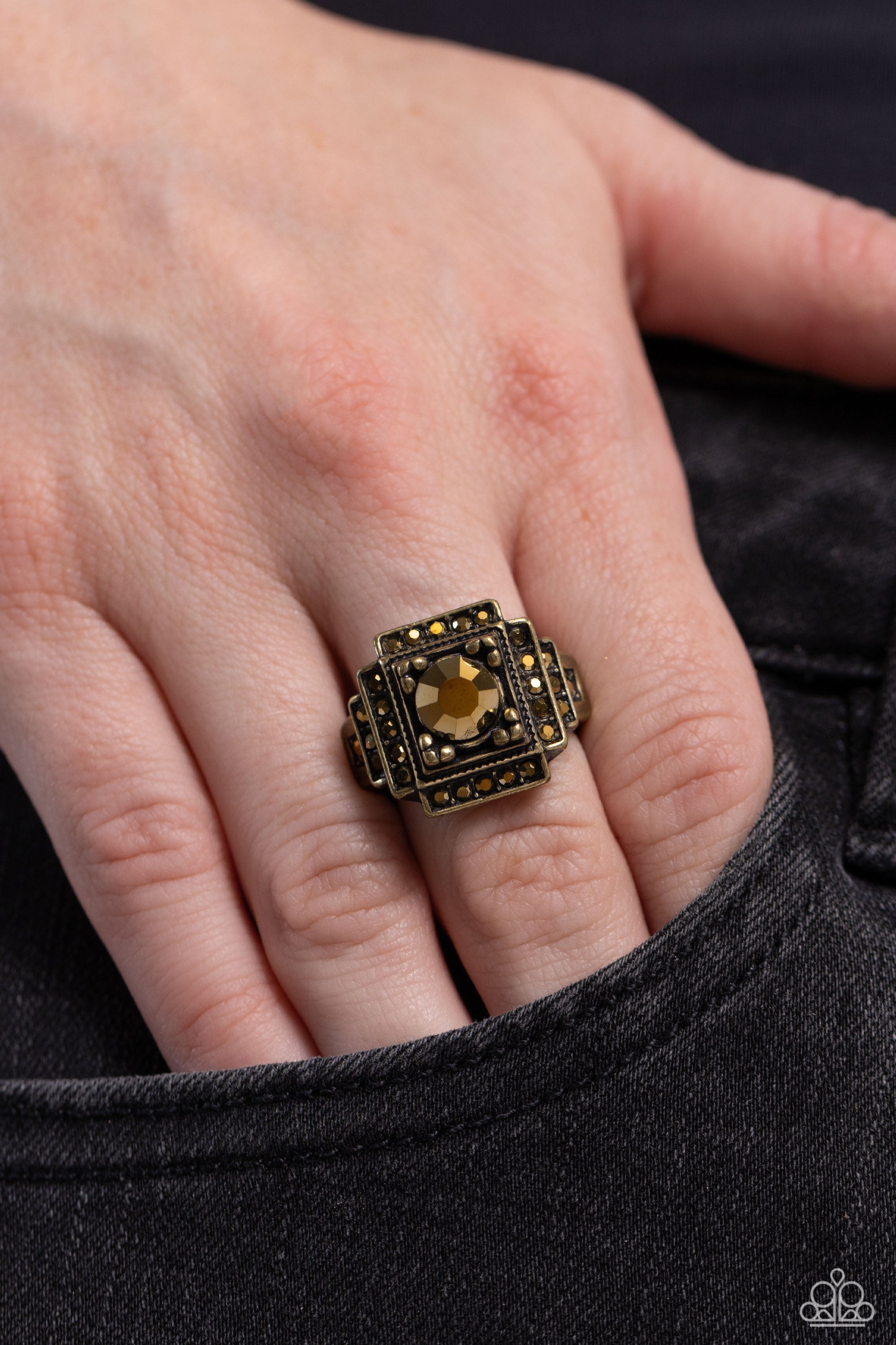 An oversized aurum rhinestone is nestled inside a studded brass frame that sits atop stacks of aurum rhinestone-encrusted rectangular frames, creating layered luster atop the finger.
