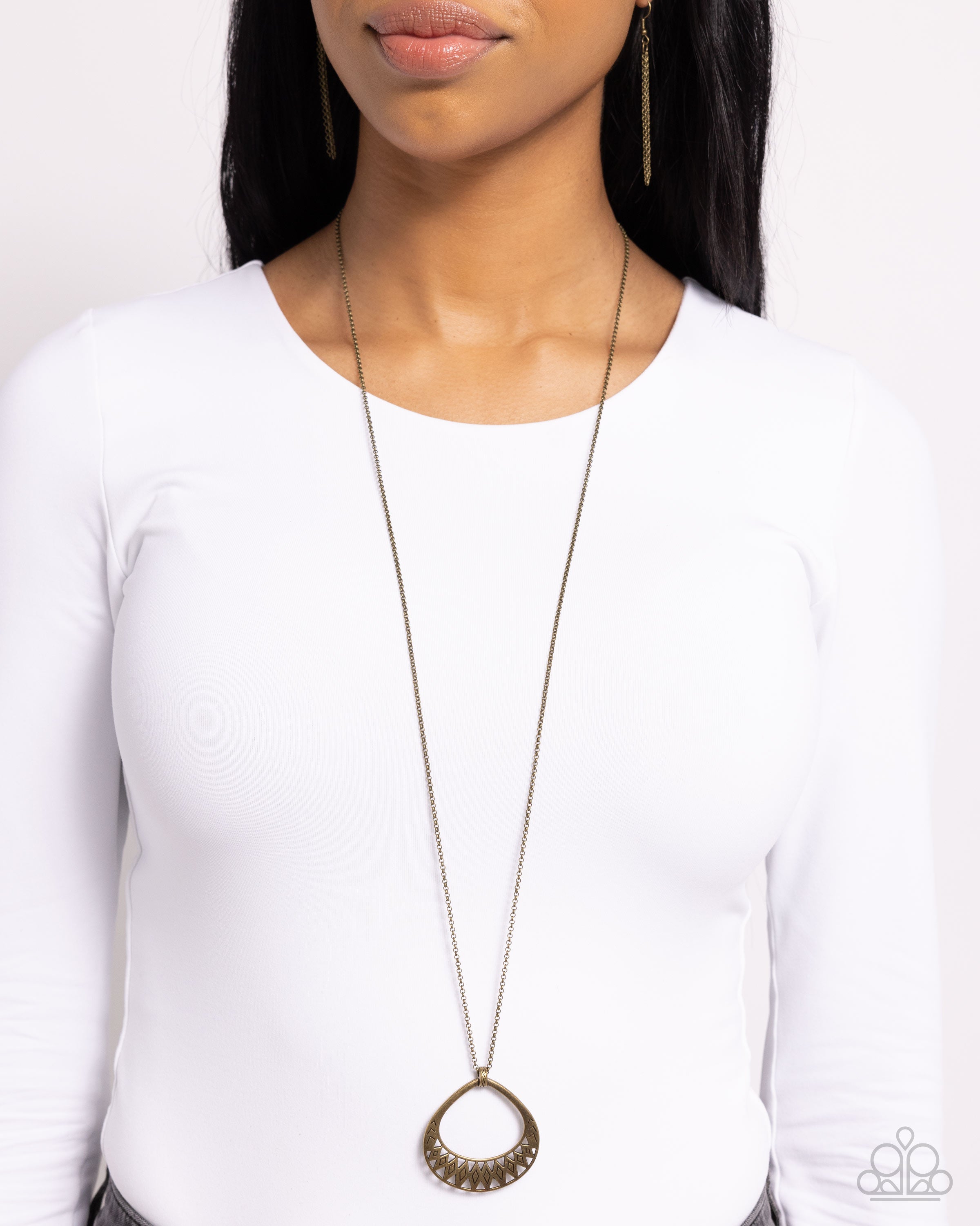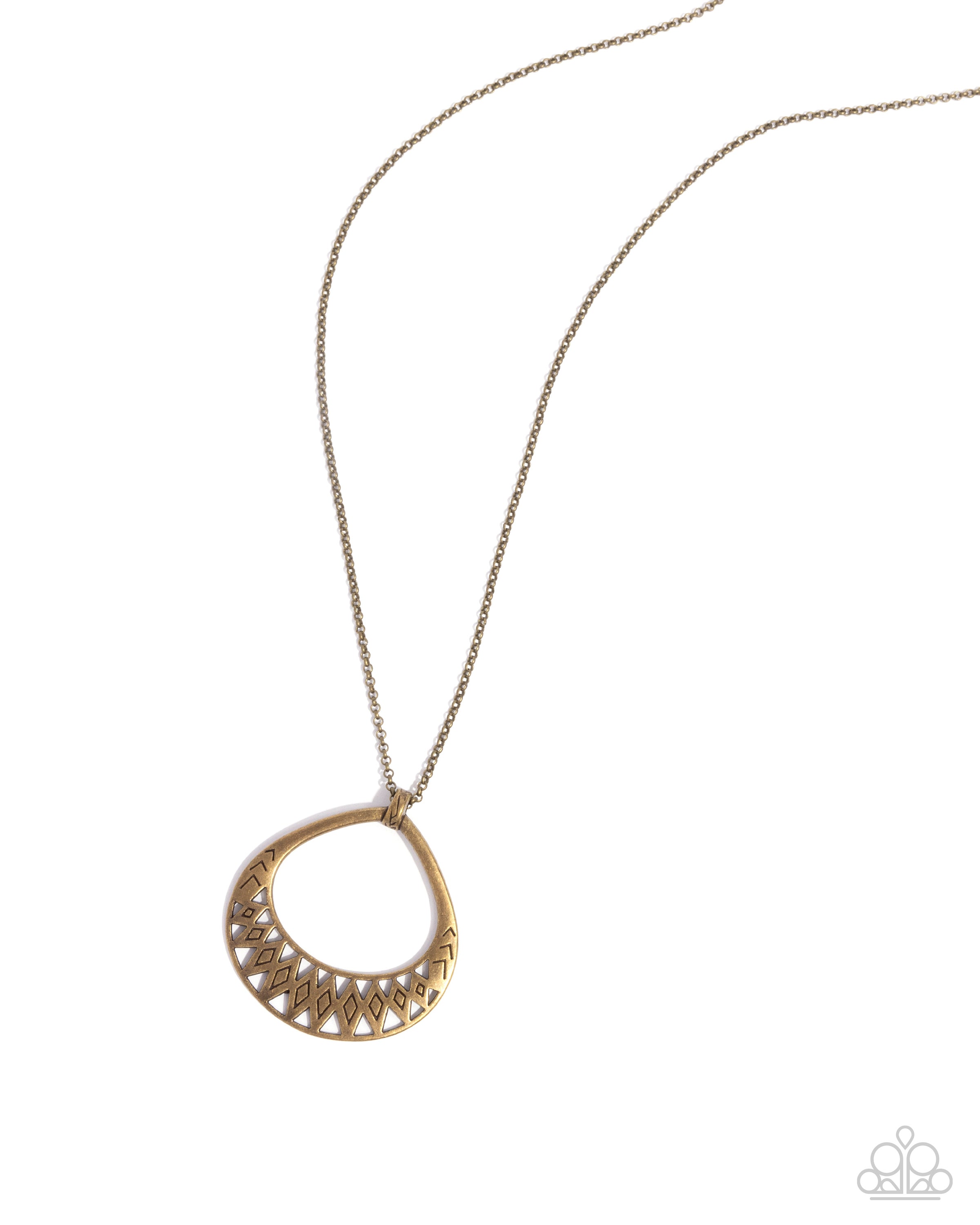 A textured silver teardrop pendant swings from the bottom of a lengthened brass chain for a funky tribal look. Features an adjustable clasp closure.