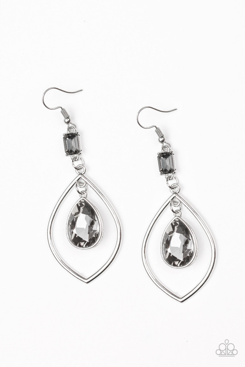 Infused with a smoky gem fitting, a dramatic smoky teardrop gem swings from a glistening silver teardrop silhouette for a glamorous look. Earring attaches to a standard fishhook fitting.
