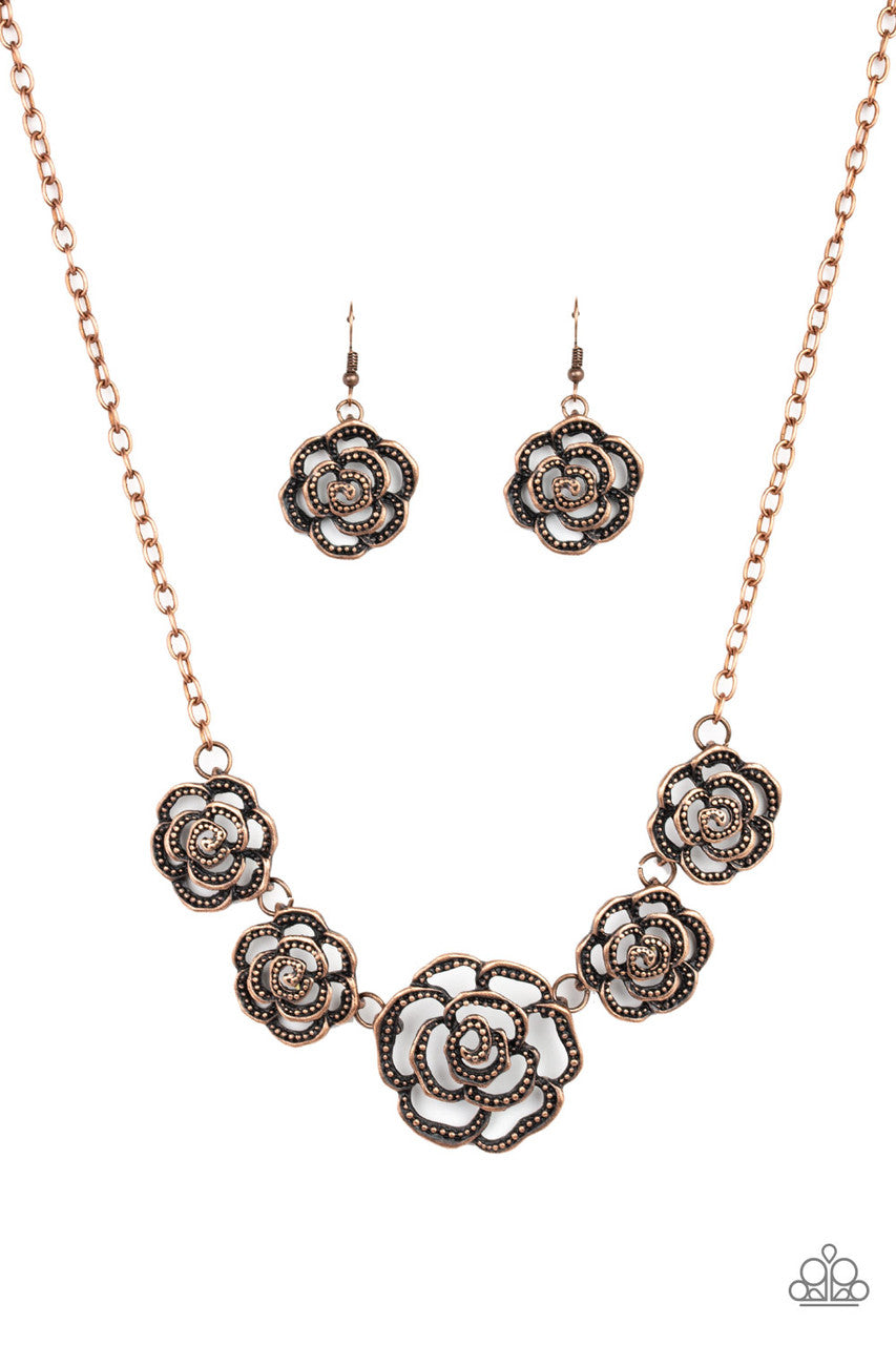 Gradually increasing in size near the center, studded copper floral frames connect below the collar in a whimsical fashion. Features an adjustable clasp closure.