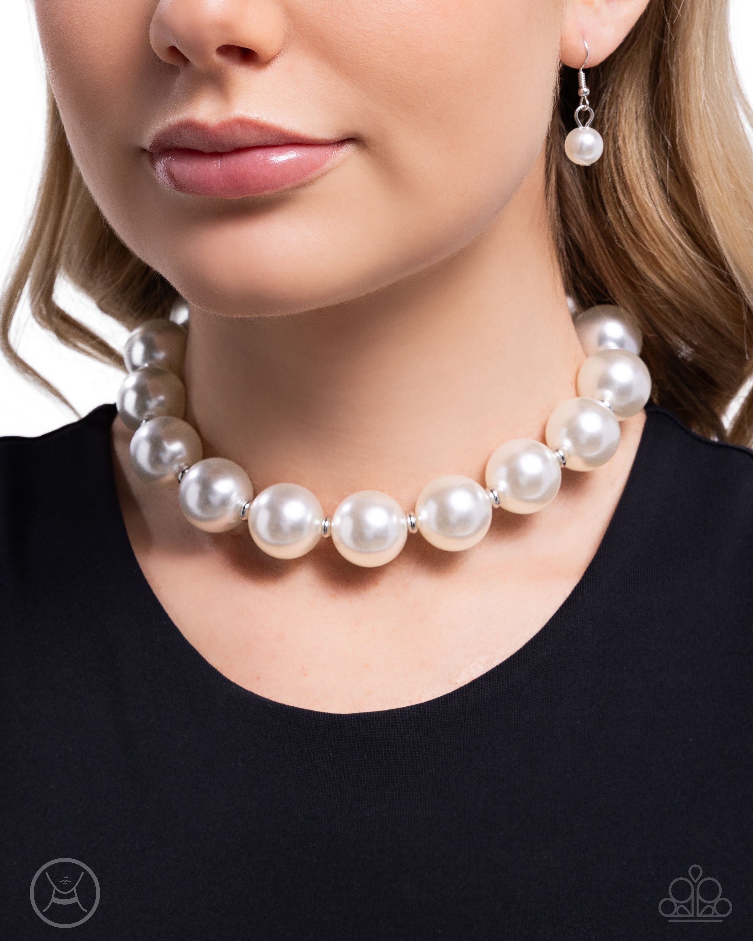 A strand of oversized glossy white pearls is accented with dainty silver beads, creating a classic and sophisticated design. Features an adjustable clasp closure.