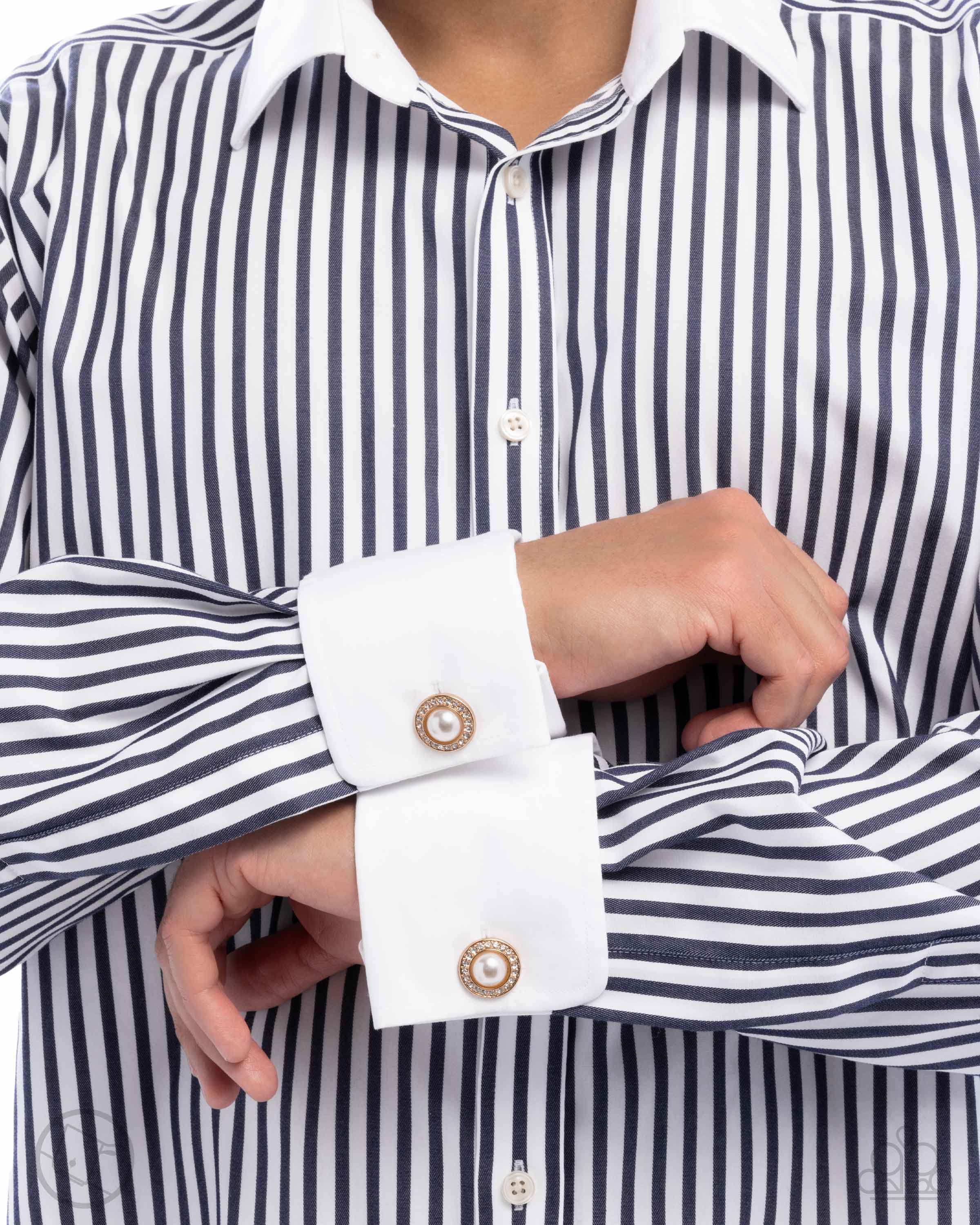 Pressed in a thick gold border of white rhinestones, a glistening half-white pearl stands out for a cultured cuff link.