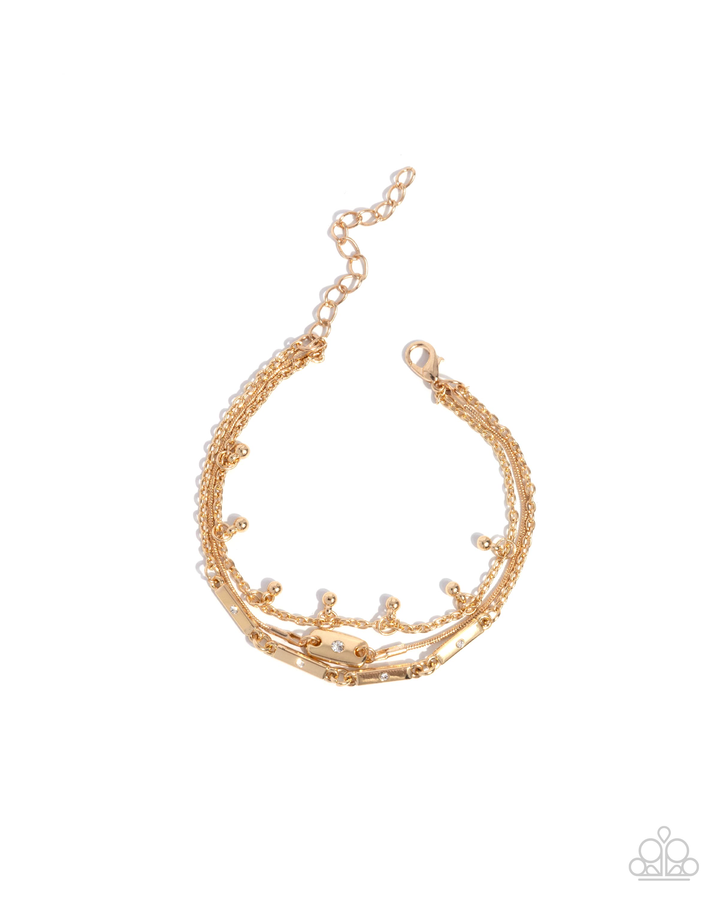 A classic gold chain infused with gold studs joins a strand of gold horizontal fittings dotted with solitaire white rhinestones. A gold horizontal fitting, also dotted with a solitaire white rhinestone, connects to a gold snake chain joining the gold strands creating a medley of radiance and color.