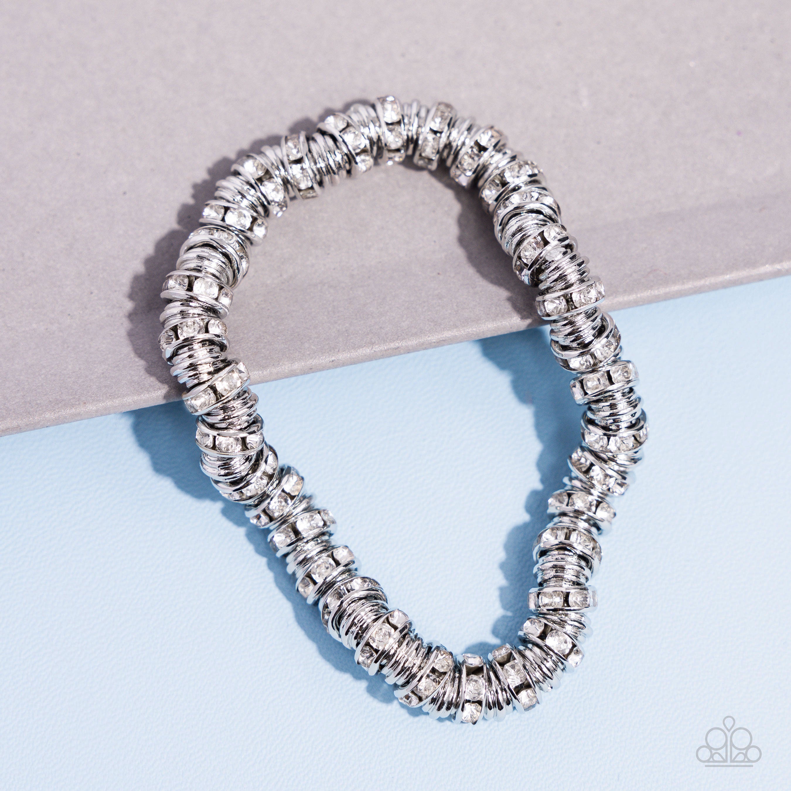 Embellished with glistening white rhinestones, silver discs sporadically interrupt seemingly endless sleek, thin silver discs along the wrist on an invisible string for a burst of shimmer and glitz.