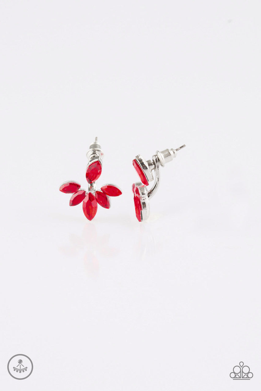 A solitaire red marquise cut rhinestone attaches to a double-sided post, designed to fasten behind the ear. Encrusted in matching red rhinestones, a double-sided post peeks out beneath the ear, creating a glittery fringe. Earring attaches to a standard post fitting.