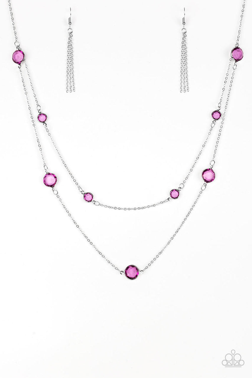 Varying in size, glassy purple gems trickle along dainty silver chains, creating sparkling layers across the chest. Features an adjustable clasp closure.