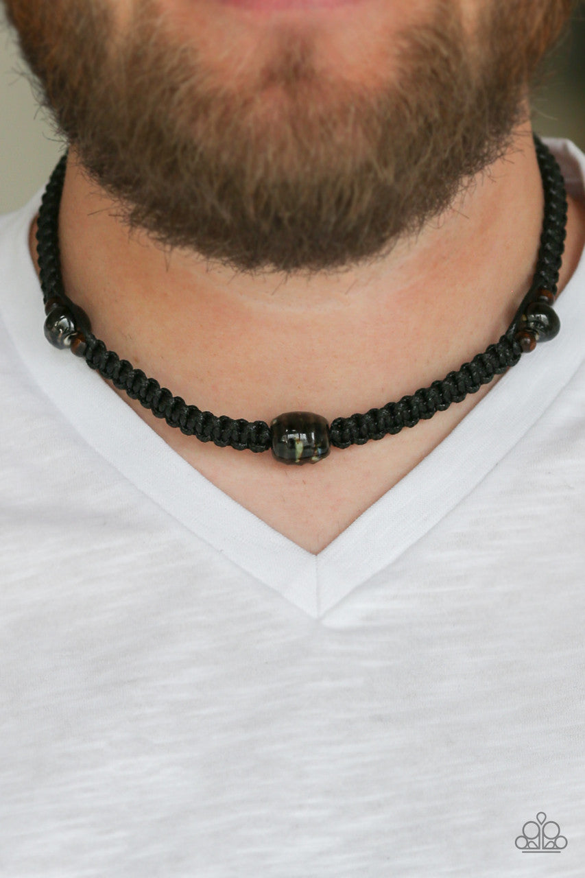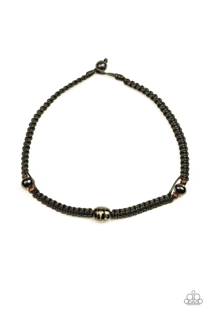 Shiny glassy accents and dainty wooden beads are knotted in place along a braided cord for an urban look. Features a button loop closure.