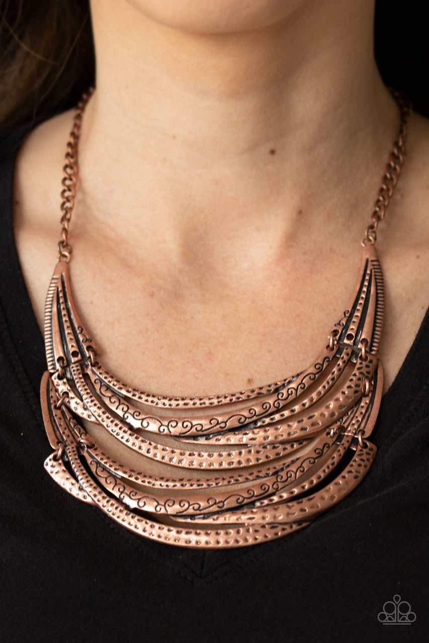 Stamped in sections of vine-like patterns, abstract hammered plates and overlapping copper bars link into an exaggerated pendant below the collar for a statement-making look. Features an adjustable clasp closure.