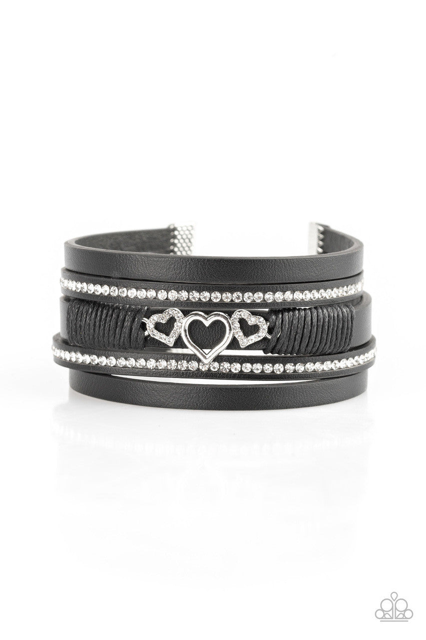 Shiny black leather and white rhinestone encrusted strips of leather layer across the wrist. Shiny black thread knots a glittery heart charm in place along the front of the centermost band for a whimsical finish. Features an adjustable clasp closure.