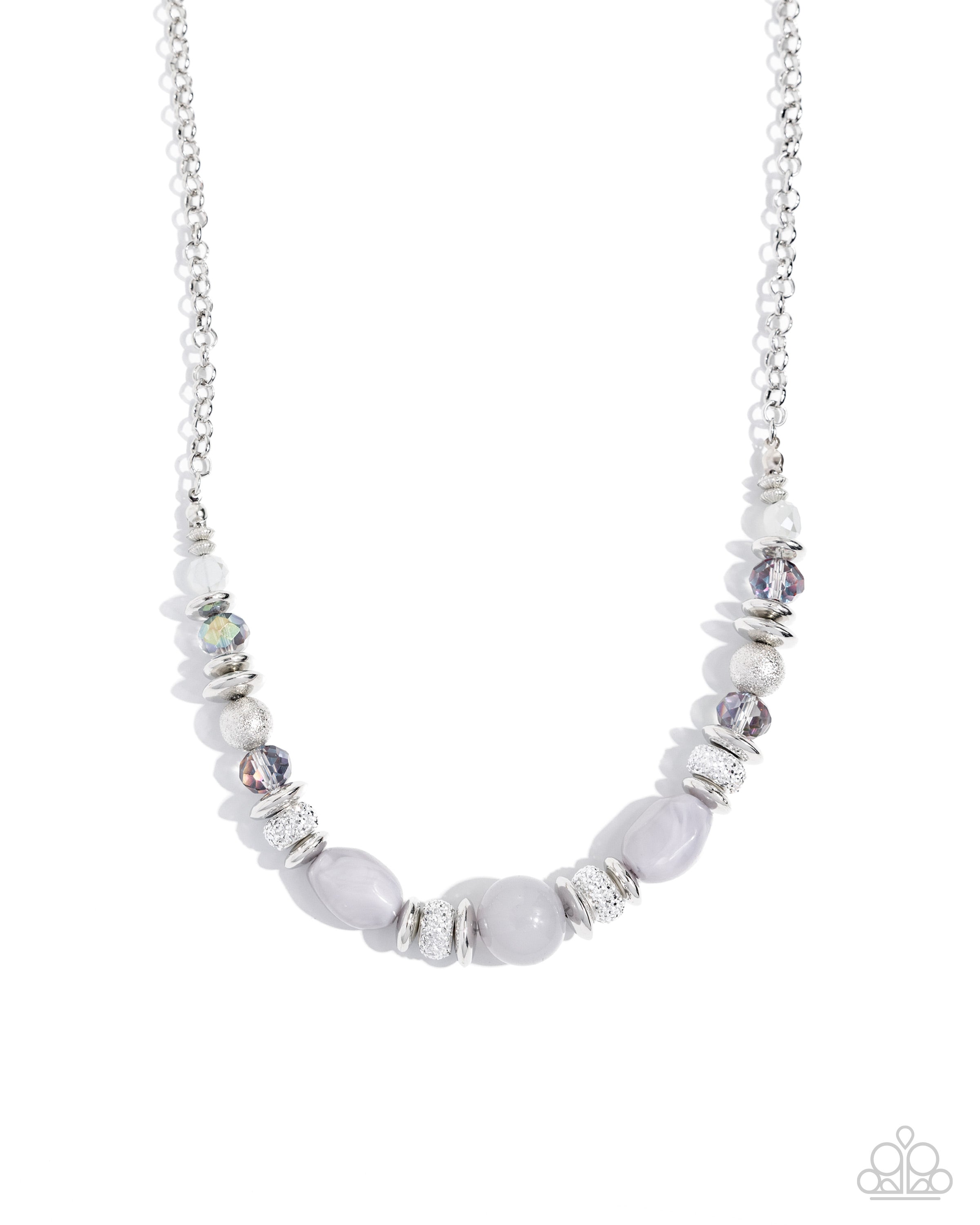 Faceted white and smoky beads, silver discs, sparkle-infused silver beads, Northern Droplet beads in various shapes, and hammered rings coalesce below a classic silver chain for a refined, radiant display. Features an adjustable clasp closure.