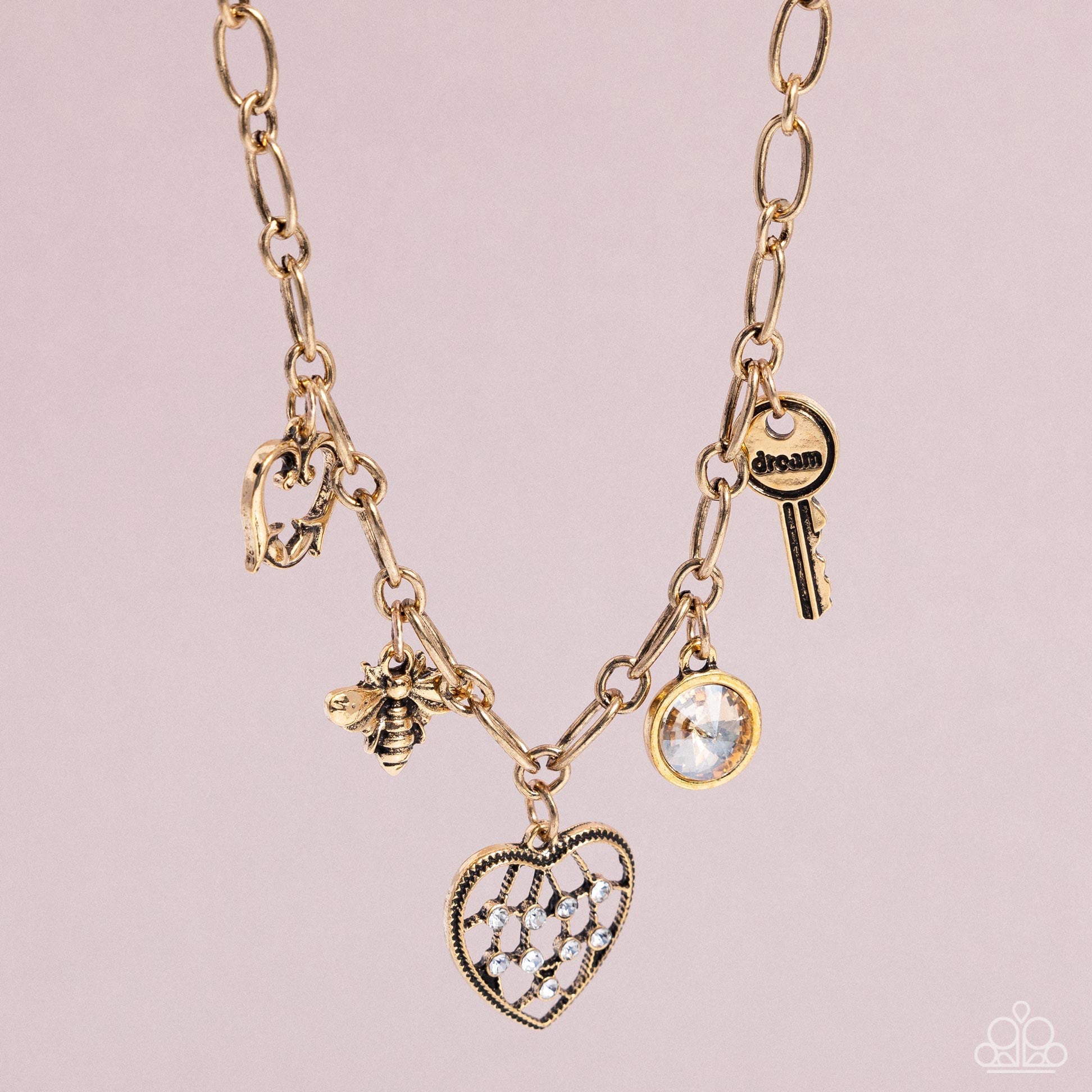 Swaying along a gold paperclip chain, a collection of whimsical charms including a textured heart, a gold bee, a white rhinestone-dotted web-textured heart, a faceted champagne gem in a gold fitting, and a gold key with the word "dream" cascade along the neckline for an eye-catching elegant look. Features an adjustable clasp closure.