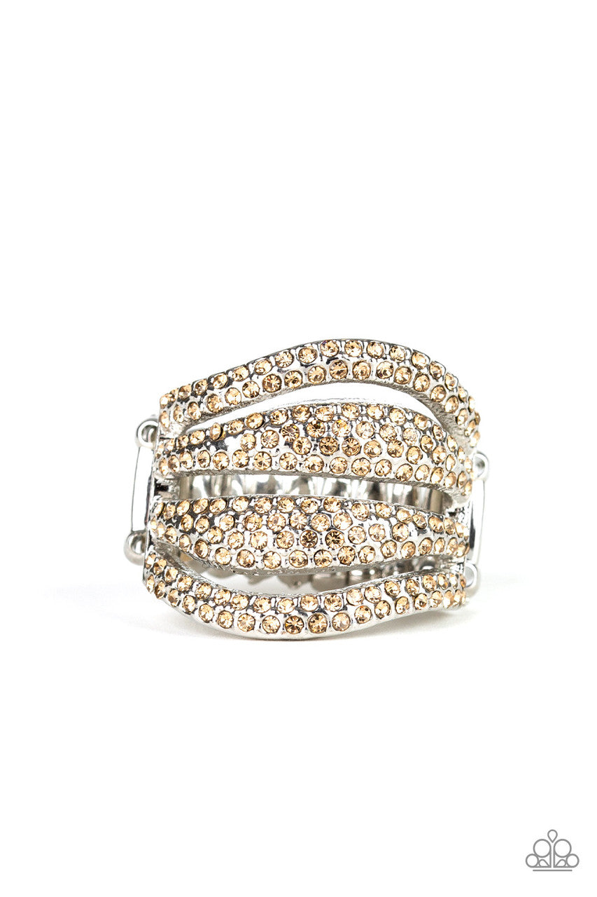 Encrusted in row after row of golden topaz rhinestones, shimmery silver bands wave across the finger, coalescing into a glitzy frame. Features a stretchy band for a flexible fit.