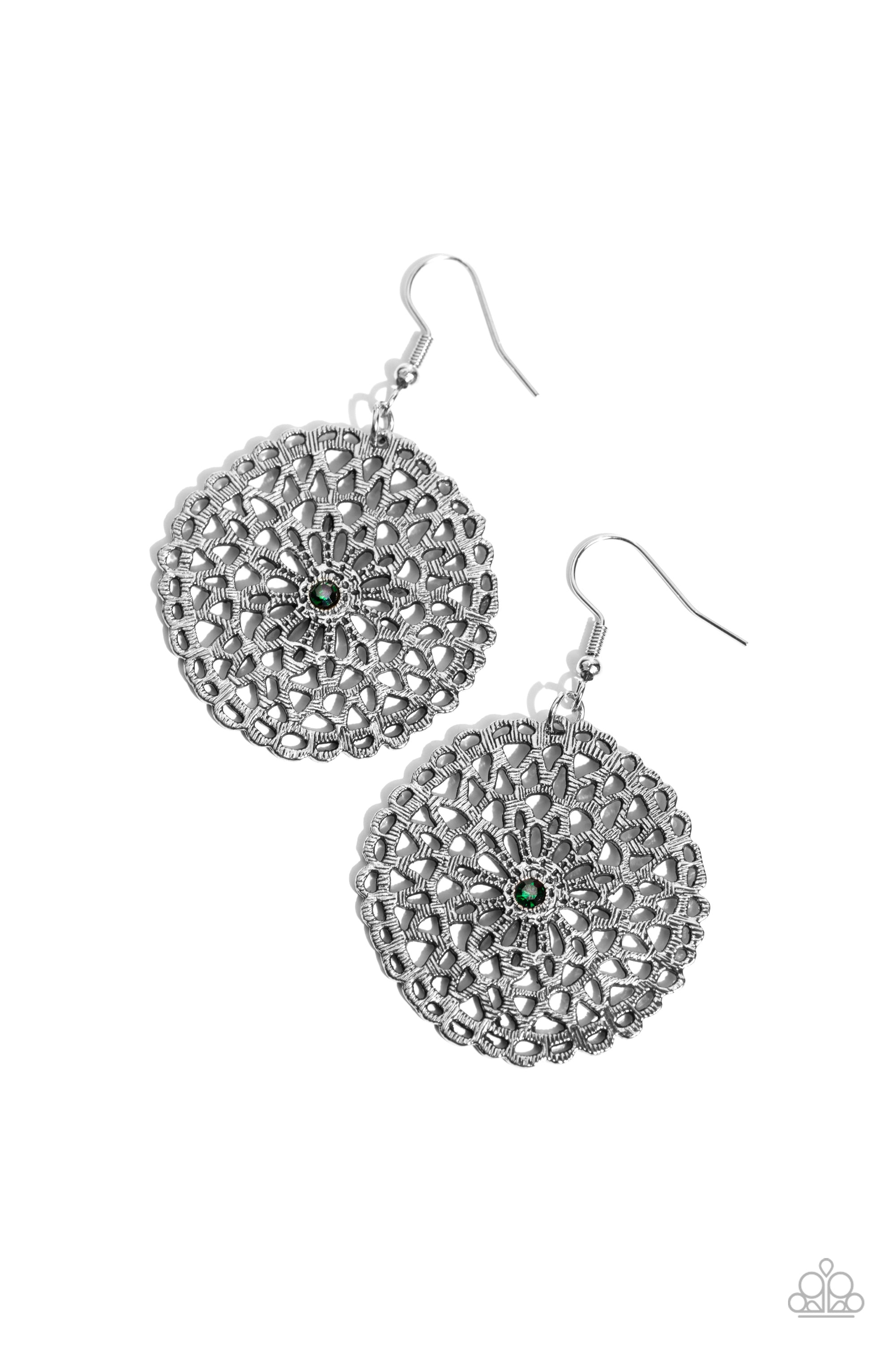 Adorned with a dainty green rhinestone sprinkled center, textured and stenciled silver petals bloom inside an asymmetrically scalloped frame for a whimsical floral fashion. Earring attaches to a standard fishhook fitting.