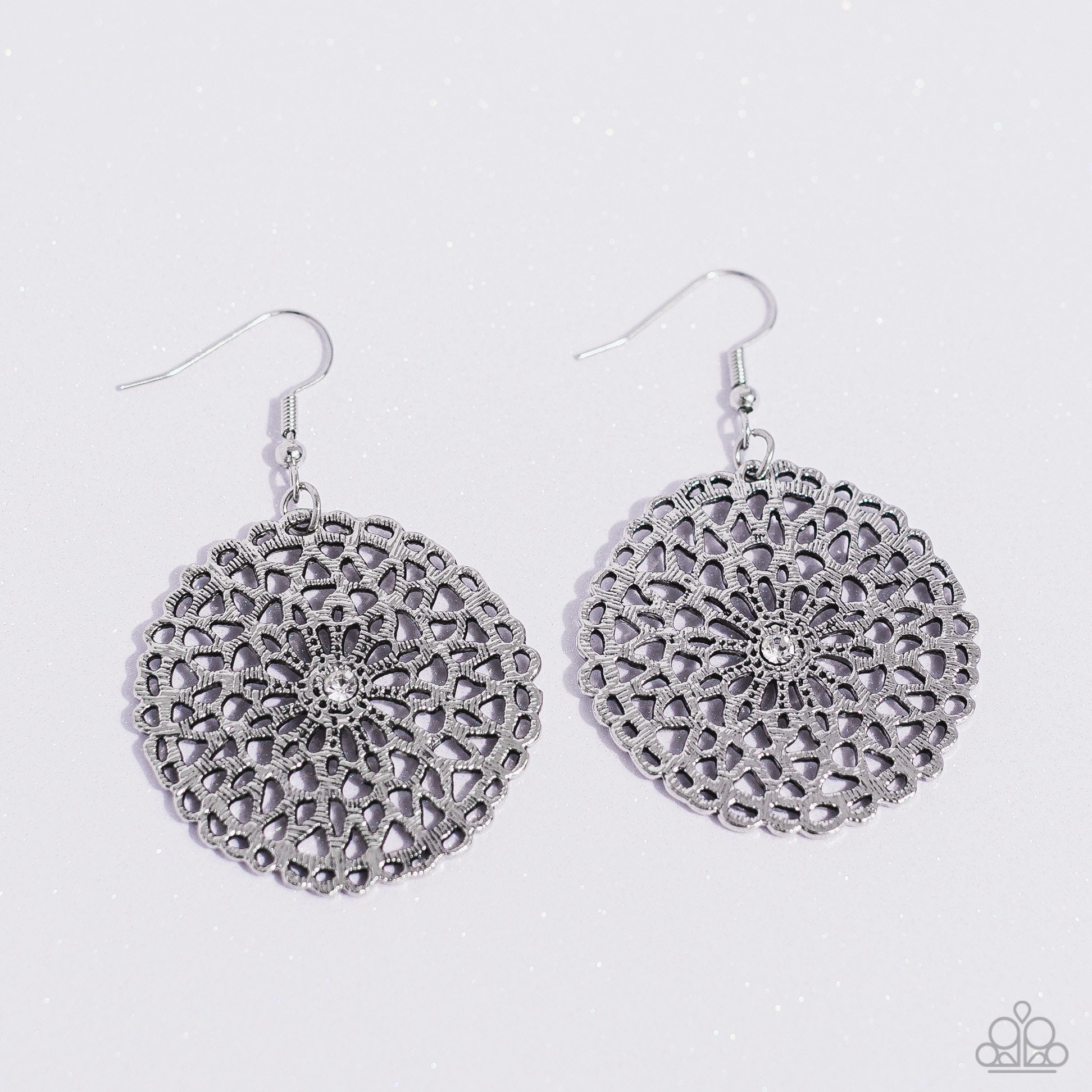 Adorned with a dainty white rhinestone sprinkled center, textured and stenciled silver petals bloom inside an asymmetrically scalloped frame for a whimsical floral fashion. Earring attaches to a standard fishhook fitting.